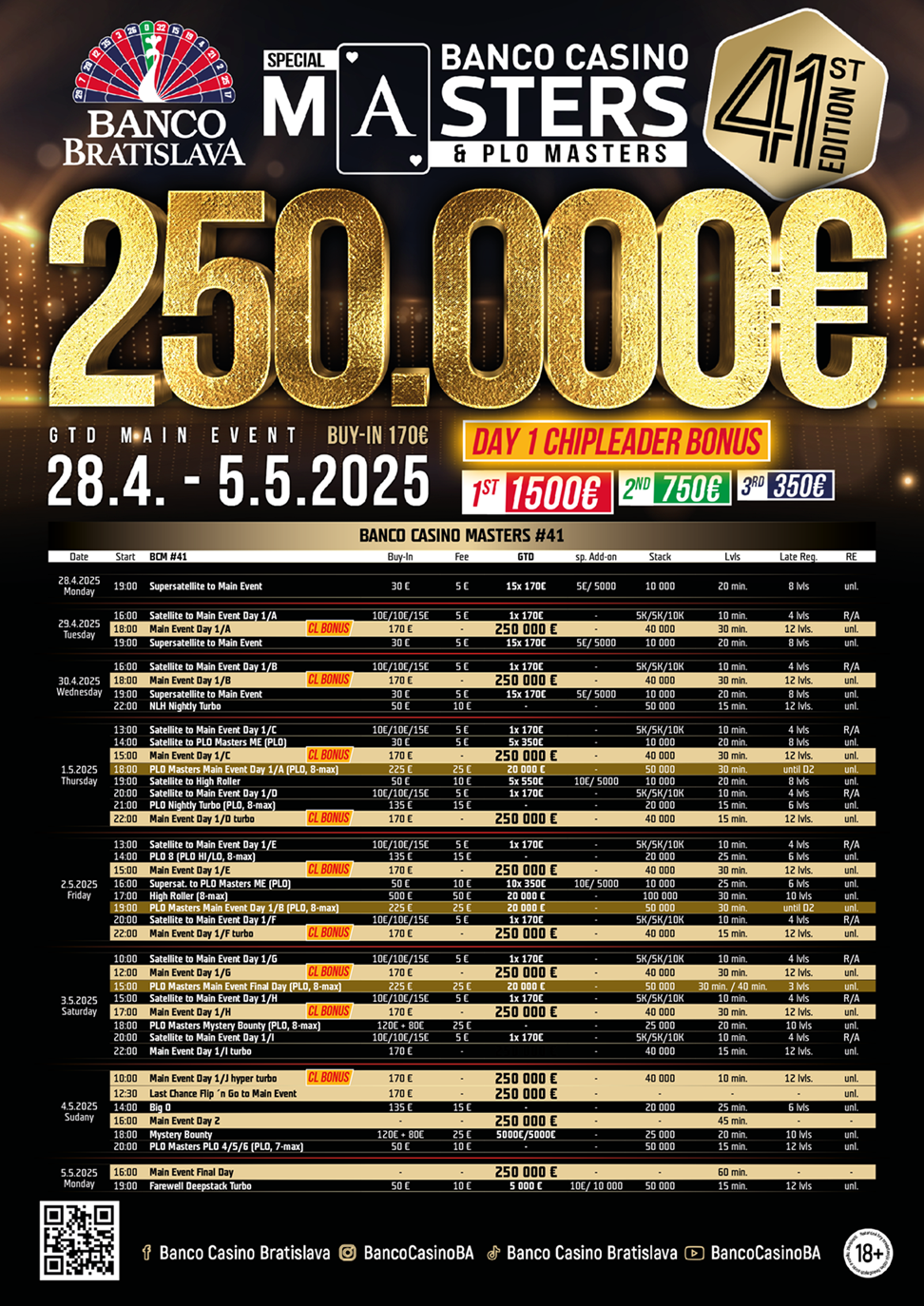 Pravidelný turnaj Banco Casino Masters, který se v Banco Bratislava koná od roku 2016, má za sebou již devátou sezónu. Během devíti ročníků Masters se dosud rozdalo více než 5.000.000 eur. Tentokrát je garance turnaje stanovena na 250.000€ s buy-inem 170€.