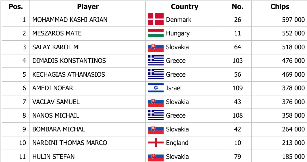 Včerejší úvodní hrací den 1A zaznamenal příjemných 109 entries. Jelikož do Day 2 postoupí vždy 10% hráčů z počtu entries, tak se včera podařilo postoupit jedenácti hráčům. Chipleaderský bonus 1.500€ získal díky největšímu stacku dánský hráč Arian Kashi Mohammad, který si do Day 2 přenesl 597.000 chipů.