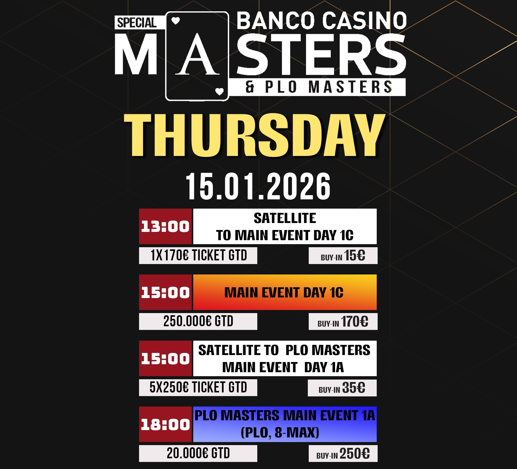 Banco Casino Masters láká hráče na svou garanci 250.000€ a Chipleader Bonus, který zajišťuje pro první tři hráče na chipech každého flightu až 2.600€. Úvodní hrací dny odstartovaly už v úterý 13. ledna a budou pokračovat podle plánu až do neděle 18. ledna. Do Day 2 postoupí vždy 10% hráčů z počtu entries a každý, kdo postoupí, se automaticky ocitne na penězích.