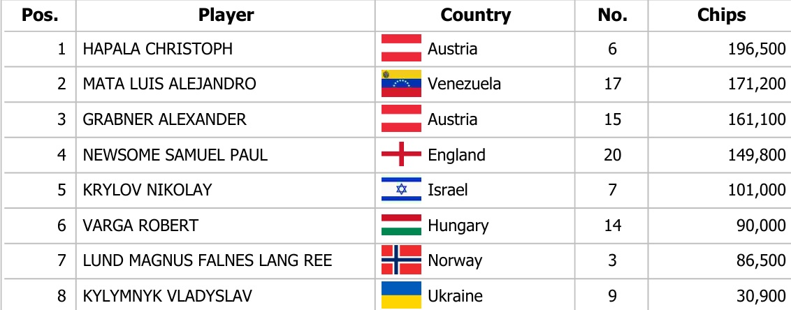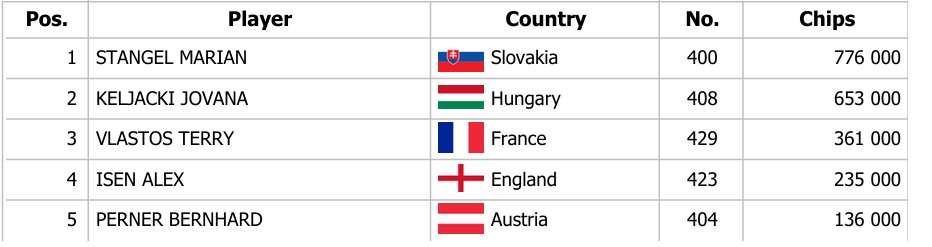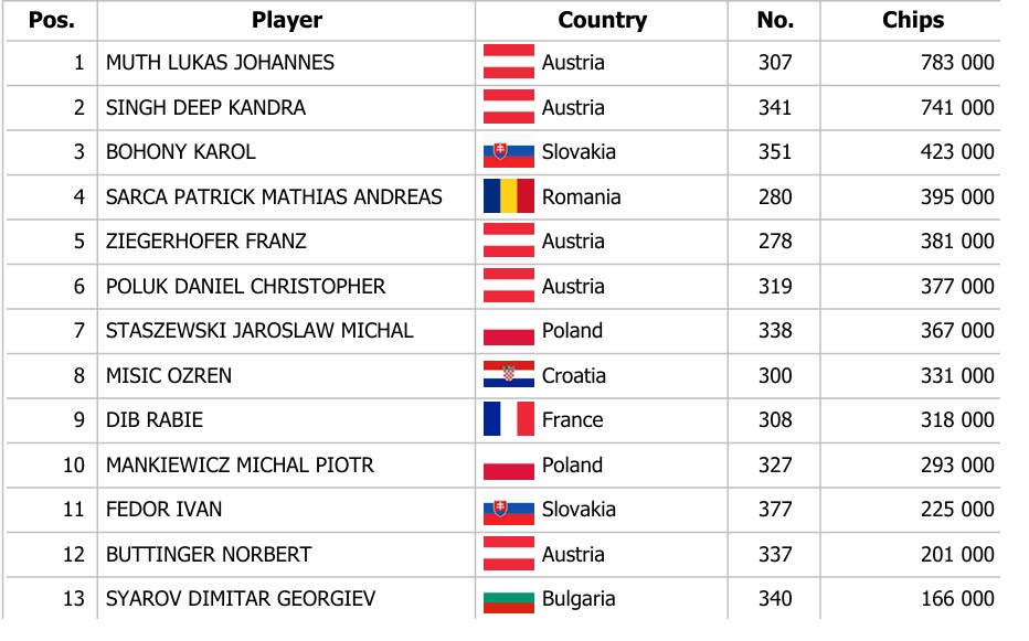 Včerejší hrací den přinesl dva flighty, přičemž ten v 15:00 zaznamenal 125 entries, díky čemuž si vstupenku do Day 2 odneslo dalších 13 hráčů. Největší stack zabalil Lukas Johannes Muth z Rakouska, který si odnesl také Chipleader Bonus ve výši 1.500€.