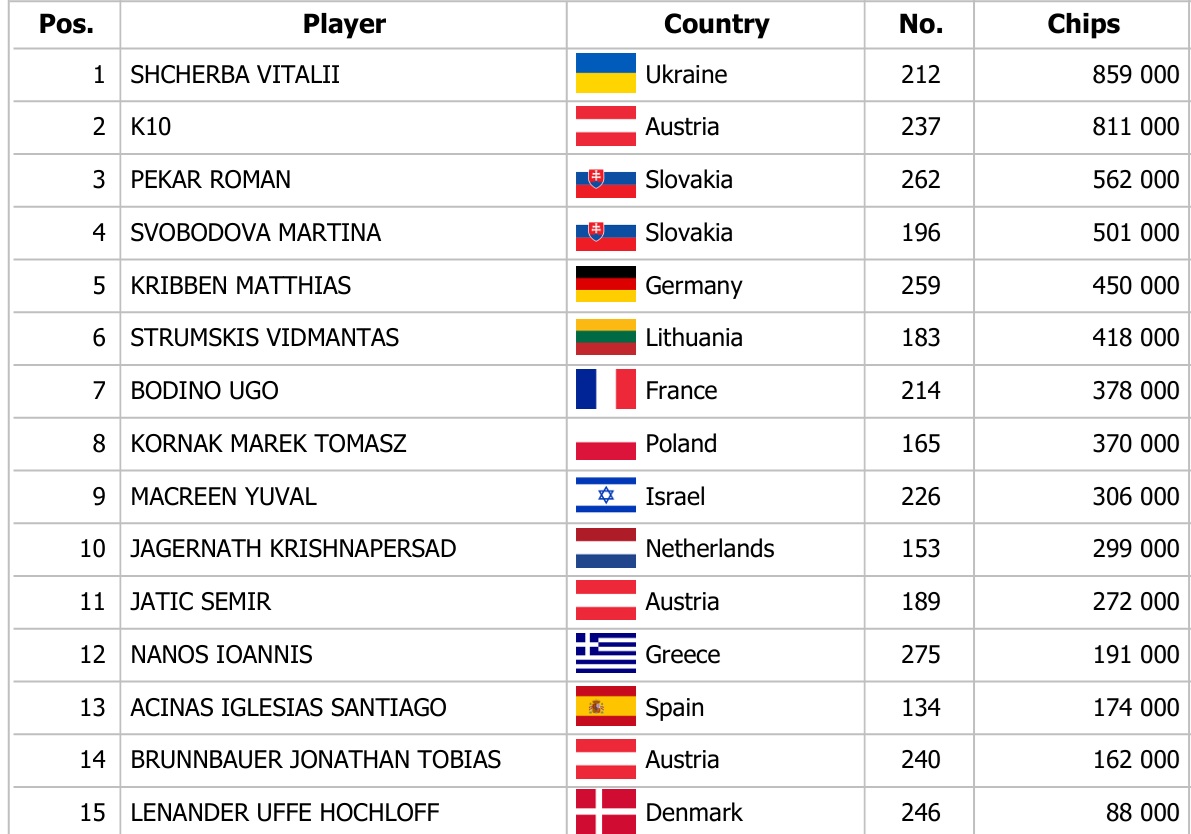 Banco Casino Masters garantuje čtvrt milionu eur v Main Eventu, do kterého je buy-in standardních 170€. Hráči z celého světa si tento legendární turnaj nechtějí nechat ujít, což potvrzují i čísla. Včera byl na programu druhý úvodní hrací den, který opět přinesl skvělou účast pokerových hráčů snažících se o postup do nedělního Day 2. Flight 1B zaregistroval celkem 146 entries, z nichž jsme poznali 15 postupujících. Chipleaderem a tedy hráčem, který si odnesl největší výhru z chipleader bonusu, se stal Vitalii Shcherba, který si za postup odnesl bonus ve výši 1.500€. Gratulujeme!