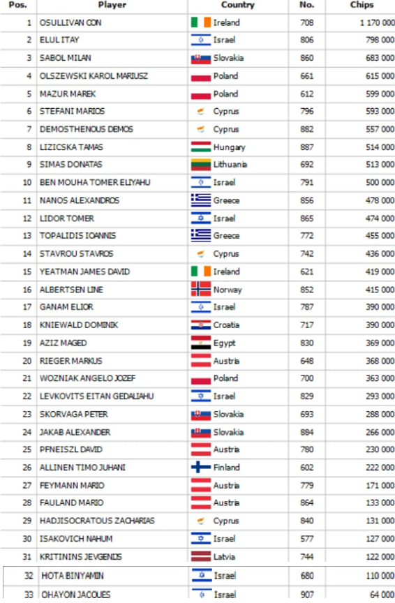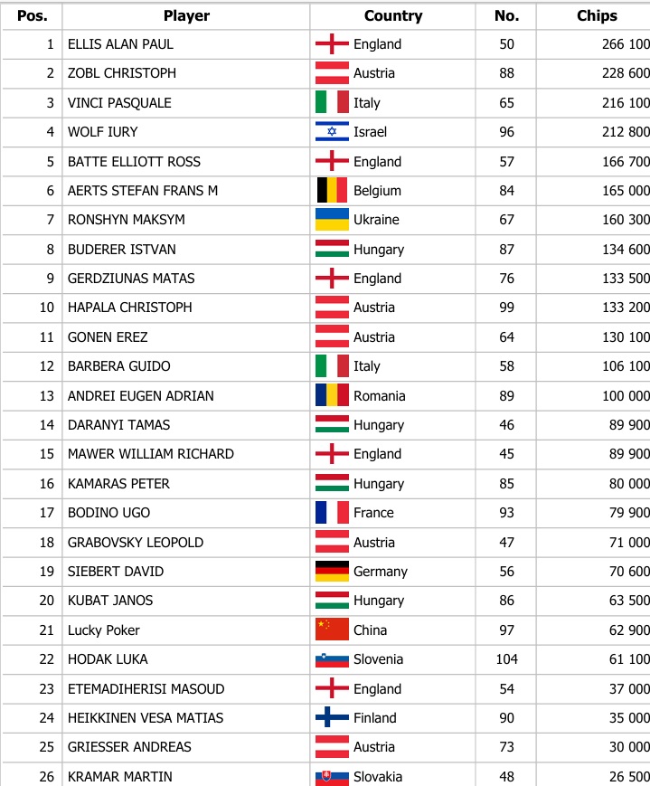 Včerejší hrací den přinesl dva flighty, ve kterých se rozdávaly i chipleader bonusy. „Plný dům“ v Banco Bratislava přinesl dohromady 445 entries v Main Eventu a nejlépe si vedli Osullivan Con z Irska a Steven Goose z Anglie, kteří si odnesli po 1.500€ díky chipleader bonusu. Jména postupujících si můžete prohlédnout na konci článku. Do Day 2 ze včerejších flightů postoupilo až 47 hráčů.
