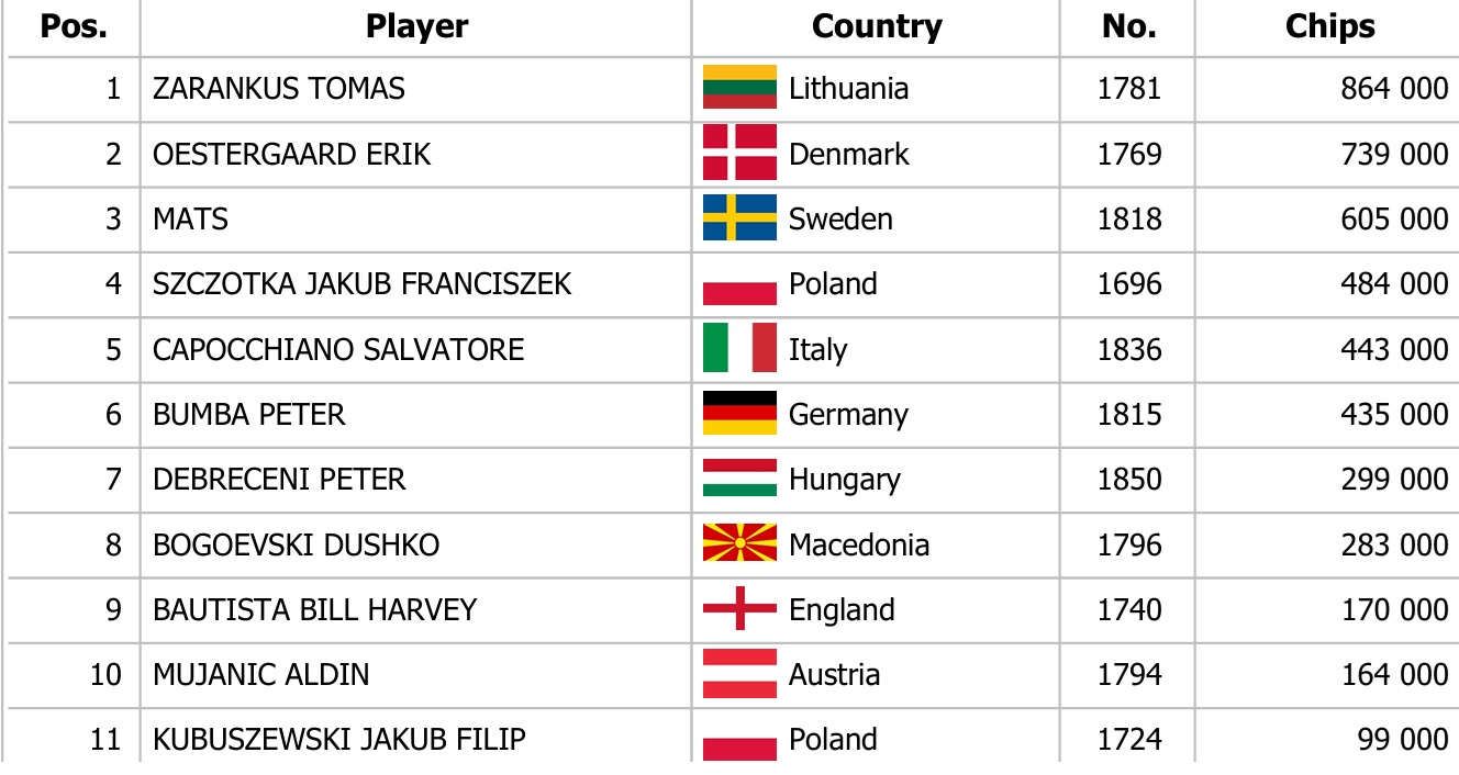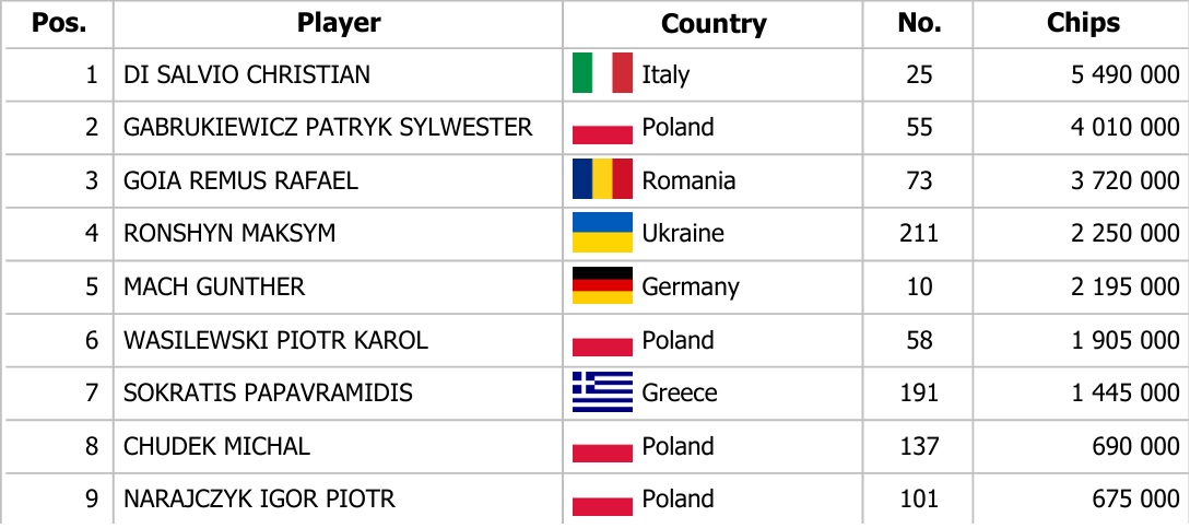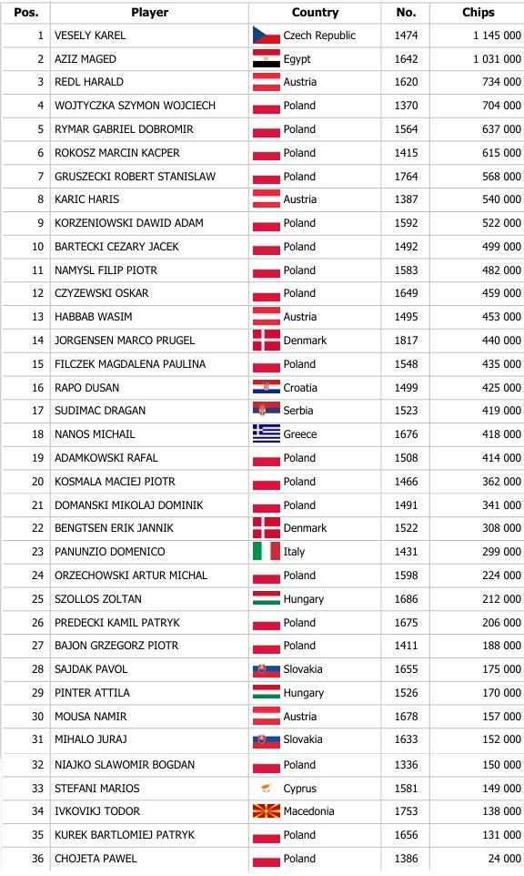 Včerejší herní den přinesl další tři flighty Main Eventu Spring Polish Poker Cupu, v nichž hráči bojovali o postup do nedělního Day 2. Už polední flight 1H přinesl 338 entries a 34 postupujících. Následoval flight 1I s 358 entries, díky čemuž si účast v Day 2 zajistilo 36 hráčů, a večerní Turbo flight pak přidal dalších 114 entries. Z něj si balíčky s chipy zabalilo 11 hráčů. Pátek se tak stal zatím nejsilnějším hracím dnem, během něhož se v Main Eventu zapsalo celkem 810 entries.
