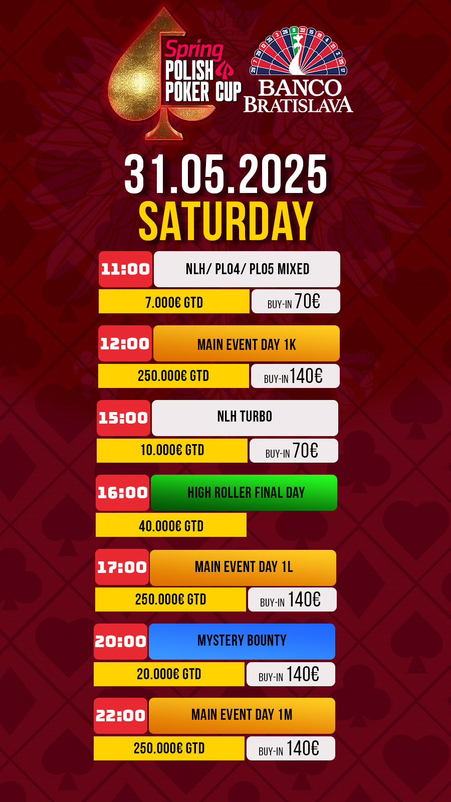 Main Event pokračuje ještě dnes posledními třemi flighty, které definitivně rozhodnou o konečné výši prizepoolu letošního Spring Polish Poker Cupu. Ty jsou na programu tradičně ve 12:00, 17:00 a ve 22:00, kdy se odehraje Turbo flight. Kromě toho dnes poznáme i jméno High Roller šampiona a od 20:00 se rozehraje také oblíbený Mystery Bounty turnaj s garancí 20.000€, do kterého je buy-in nastaven na 140€.