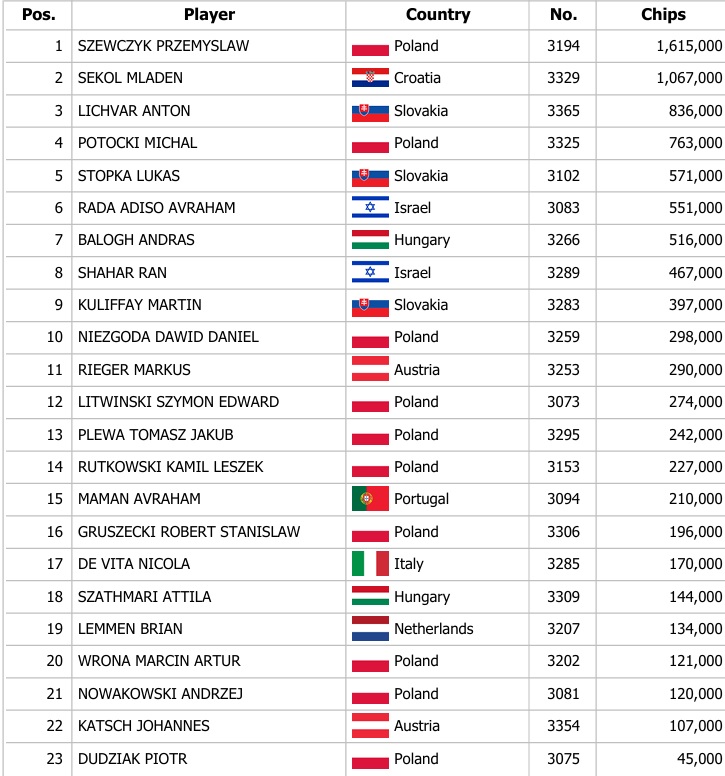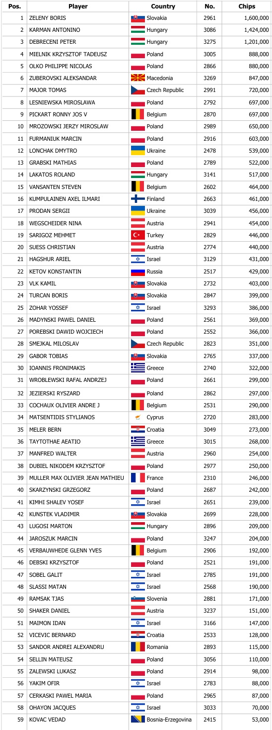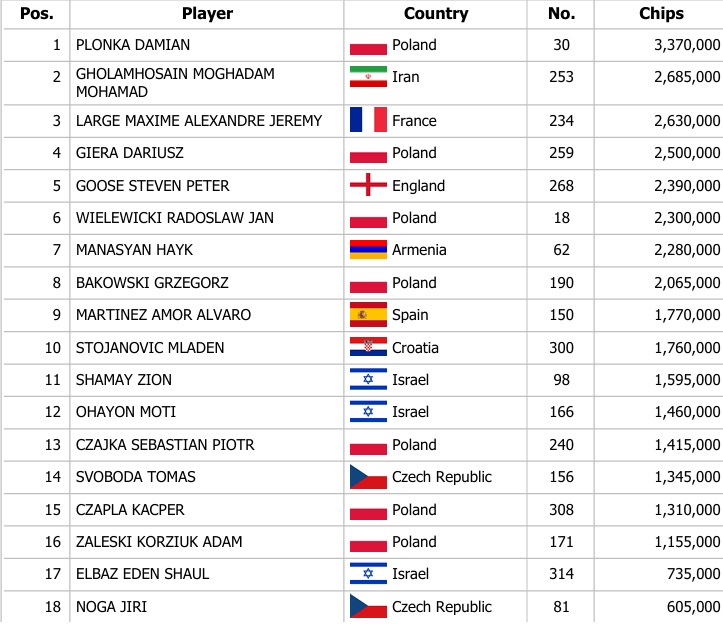 Celkově během otevřené registrace zaznamenali hráči až 331 entries a tak se prizepool vyšplhal až na 112.540€. Ve hře zůstalo nejlepších 18 hráčů, kteří se dnes utkají ve finálovém dni, kde na šampiona čeká odměna 22.515€. Kdo se stane šampionem? To se dozvíte už v zítřejším článku.