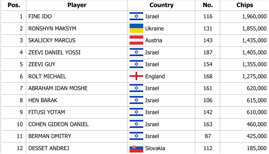 Main Event Israeli Federation Cupu pokračoval druhým úvodním hracím dnem s označením 1B, kdy se hráčům podařilo registrovat 122krát. Stacky do Day 2 zabalilo 12 hráčů, kteří si tak zajistili finanční odměnu. Největší stack včera zabalil Ido Fine z Izraele a také nový šampion Masters Ukrajinec Maksym Ronshyn, který si svoji výbornou formu přenesl i do tohoto eventu.