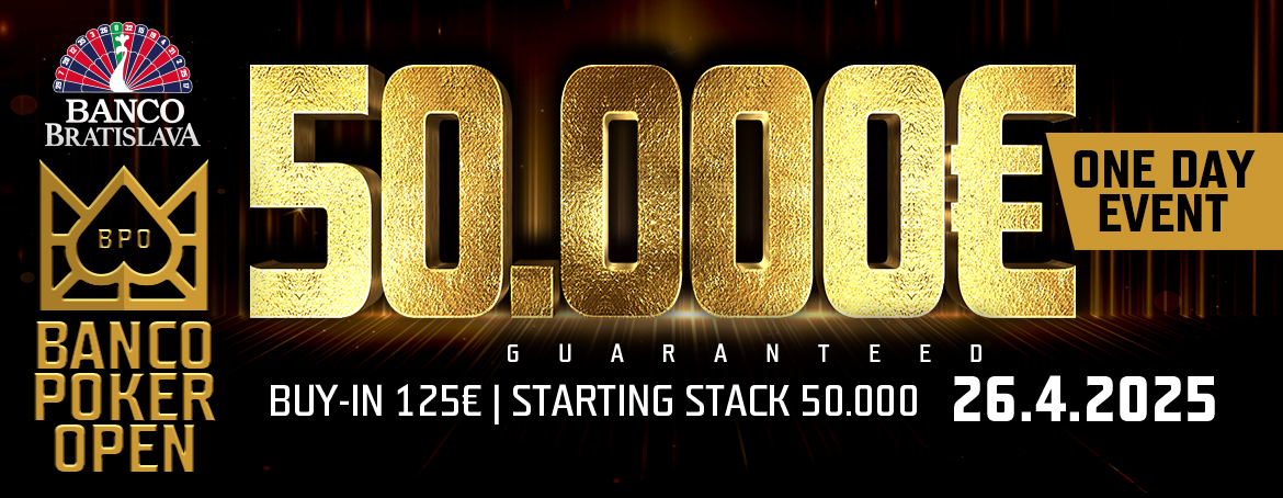 Jak by to vypadalo, kdyby se v Banco Bratislava neodehrál velký jednodenní turnaj? Už tuto sobotu 26. dubna se celá pokerová veřejnost může zapojit do turnaje Banco Poker Open, který startuje v 17:00. Kromě skvělé pokerové atmosféry se připravte i na garanci rovných 50.000€ při 125€ buy-inu. V turnaji dostane každý z hráčů 50.000 chipů na hru a na vítěze bude čekat krásná finanční odměna.
