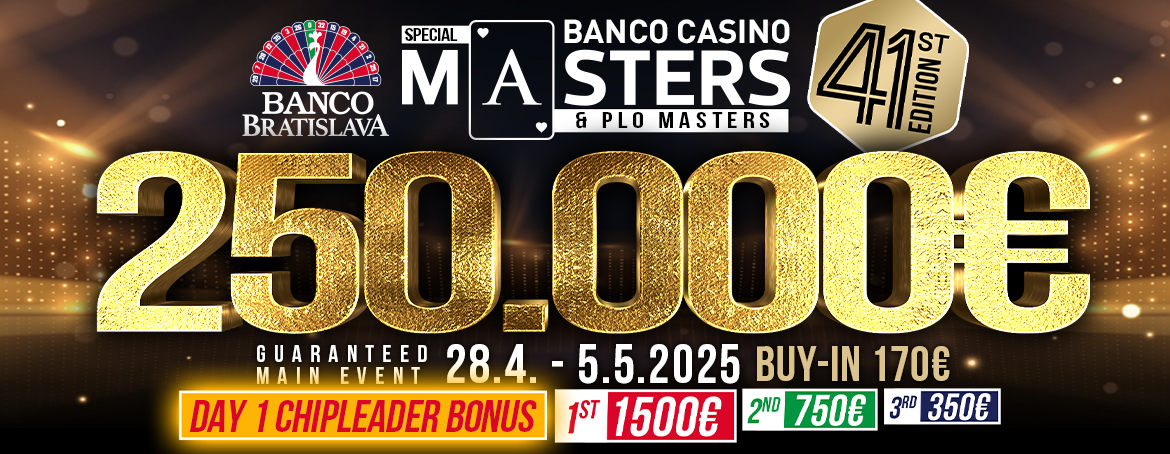 Po téměř devíti měsících přichází zpět nejznámější turnaj a jeho 41. edice. Banco Casino Masters přinese Main Event s garancí 250.000€ za 170€. Banco Bratislava si pro hráče připravilo i novinku v podobě Chipleader Bonusu. Novinka přinese v každém hracím dni prvním třem hráčům na chipech skvělé bonusy do výše až 2.600€. Chipleader získá 1.500€, druhý v pořadí 750€ a třetí získá 350€. Tento bonus bude vyplácen hned po skončení flightu.