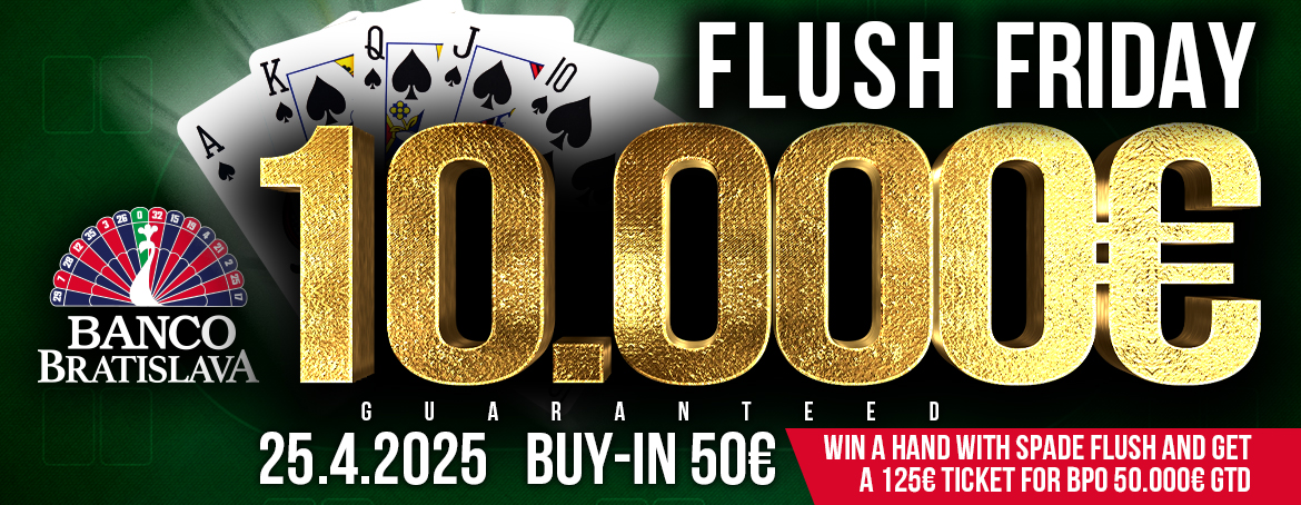 Ještě před samotným Banco Poker Open se v pátek odehraje turnaj s názvem Flush Friday, který nese garanci 10.000€ za vstupné 50€. A co znamená Flush Friday? Každý hráč, kterému se podaří trefit Spade Flush a vyhraje danou handu, získá extra odměnu v podobě 125€ ticketu na sobotní Banco Poker Open zcela zdarma.