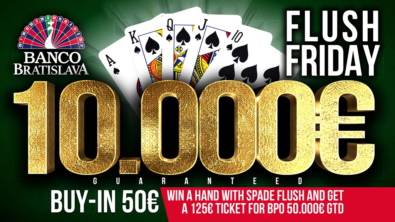 Den před Banco Poker Open se odehraje další novinka z dílny Banco Bratislava. Turnaj s názvem Flush Friday bude garantovat 10.000€ a to za 50€. Co si představíte pod Flush Friday? Každý kdo „trefí“ jakýkoliv flush ve spadech a vyhraje danou handu, získá EXTRA odměnu a tou bude lístek v hodnotě 125€ na sobotní Banco Poker Open.