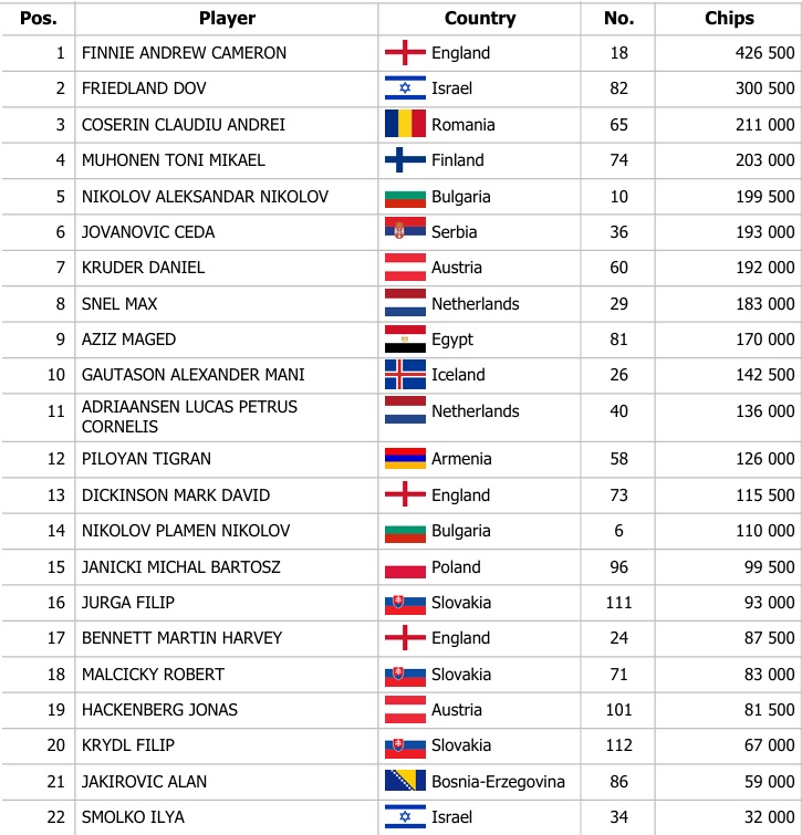 Včerejší první hrací den Main Eventu během čtrnácti levelů přilákal 112 entries. Z postupu do další fáze se mohlo radovat 22 hráčů. Nejvíce žetonů si z prvního flightu odnesl Angličan Andrew Finnie, který dokázal zabalit 426.500 chipů.