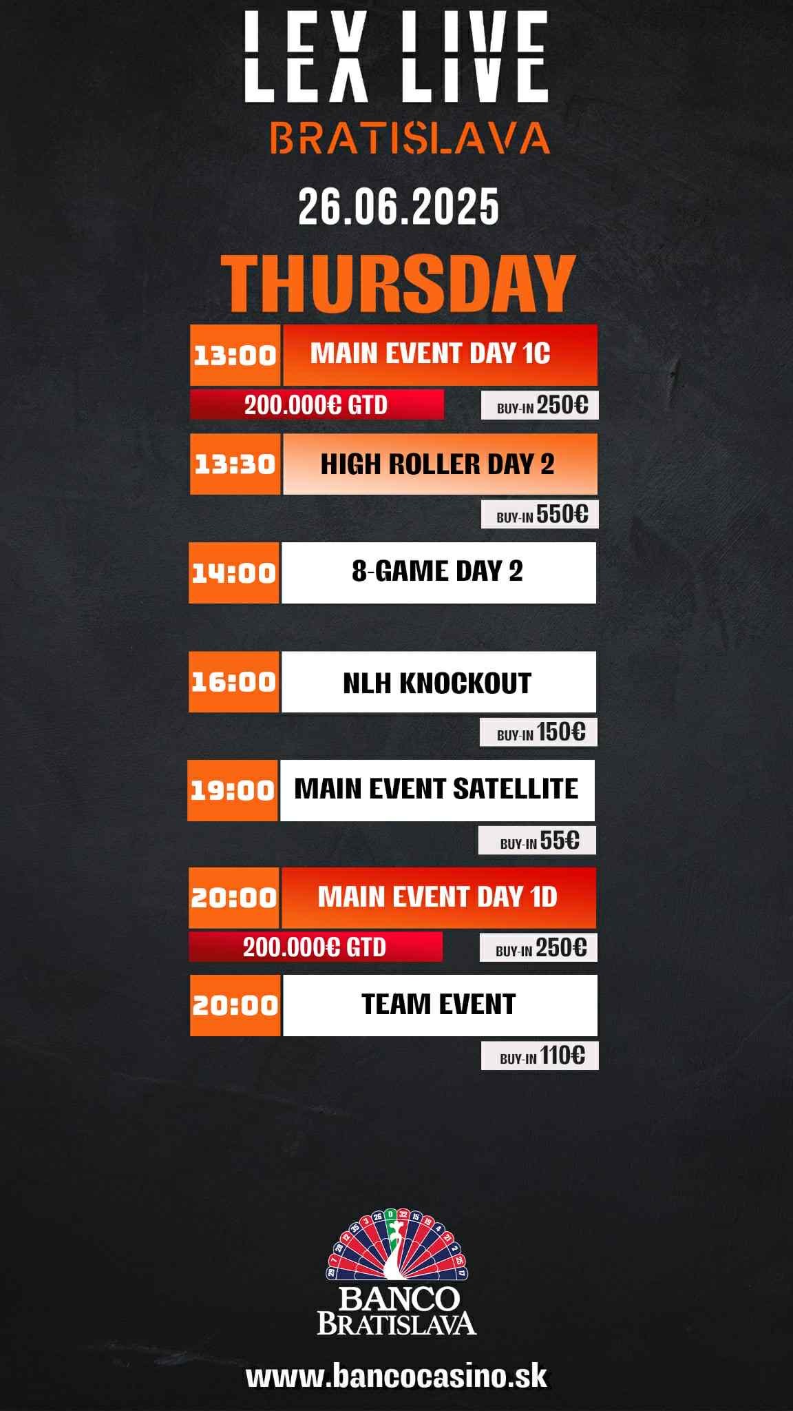 Lex Live IV a jeho Main Event pokračují dnes dalšími dvěma flighty, které startují ve 13:00 a ve 20:00. Struktura zůstává nezměněná, takže o garantovaných 200.000€ můžete hrát už za 250€. Kromě toho se dnes, ve čtvrtek 26. června, můžete zapojit do dalších turnajů – jejich kompletní program najdete níže.