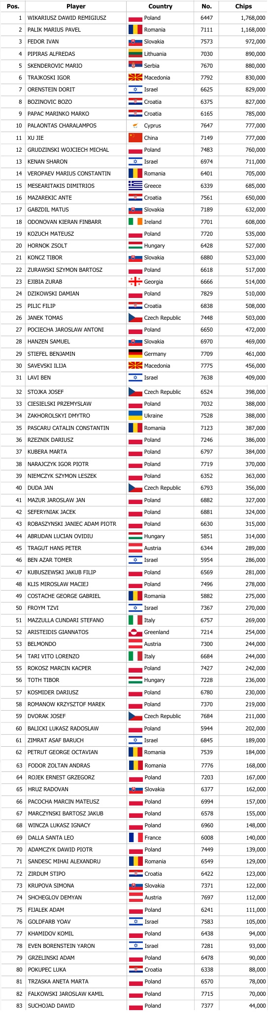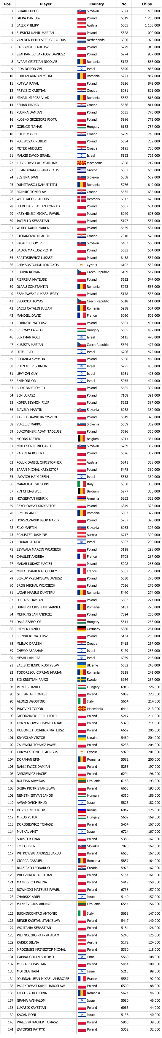 Sobota, která často ukazuje, že patří k nejsilnějším hracím dnům, zažila opět největší nápor. Zájem o Polish Poker Championship byl enormní i tentokrát a všem vyrazil dech. Celkově se hráči během sobotních flightů postarali až o 2 806 entries, které navýšily celkový prizepool téměř na milion eur. V prvním z trojice flightů se na chipleaderskou stoličku posadil domácí Ľuboš "Lokšo" Bihári, který si zabalil 1 403 000 chipů. Postupujícím gratulujeme a přejeme hodně štěstí v boji o titul mistra Polska.