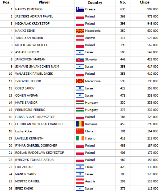 Skvělá účast hráčů v Banco Bratislava během posledních dvou dnů Winter Polish Poker Cupu přinesla dalších 549 entries do Main Eventu, ve kterém se hraje o garanci 300.000€. Počty entries rekordně přibývají a v turnaji je již 656 entries. Podaří se překonat stanovenou garanci?