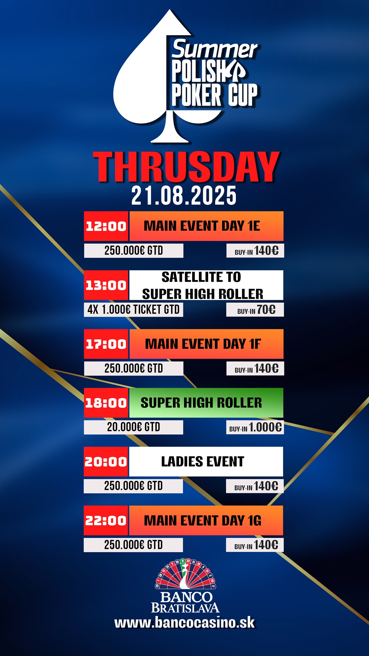 Dnes to v Banco Bratislava bude vřít, protože dnes přijede do Bratislavy více než 400 polských hráčů, kteří se postarají o skvělou atmosféru a ještě lepší akci. Na programu jsou nejen tři možnosti v Main Eventu s 250 000 € garancí, které startují ve 12:00, v 17:00 a ve 23:00, ale také Ladies Event či Super High Roller - 20 000 € GTD se vstupným 1 000 €.