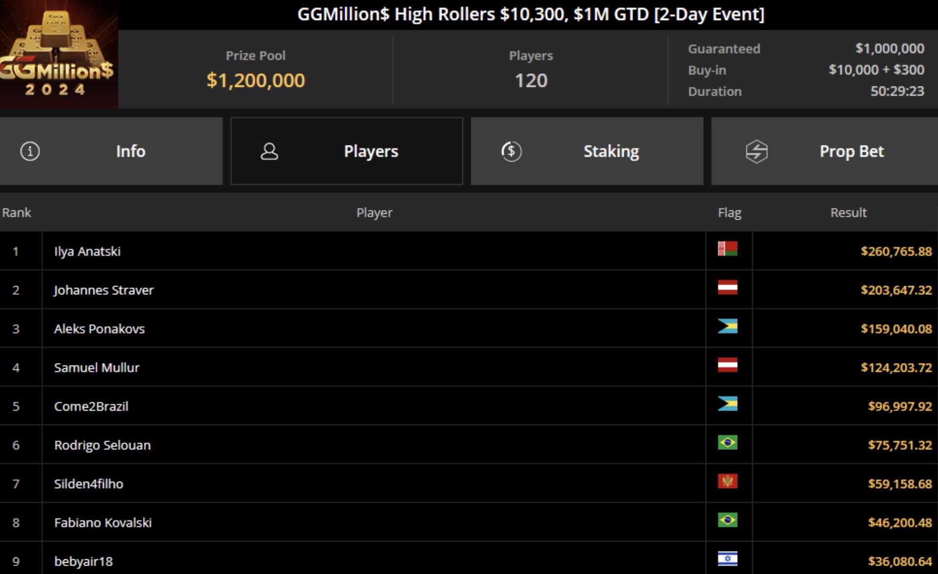 Turnaj přinesl 120 entries, které znamenaly prizepool 1.200.000$. Na vítěze zde čekala částka 260.765$ a o tu na finálovém stole bojovala jména jako Aleks Ponakovs nebo Samuel Mullur. Samuel začal s třetím největším stackem, nakonec se však musel spokojit se 4. místem, které mělo hodnotu 124.203$. Na třetím místě skončil Aleks Ponakovs a vítězem se stal Ilya Anatski.