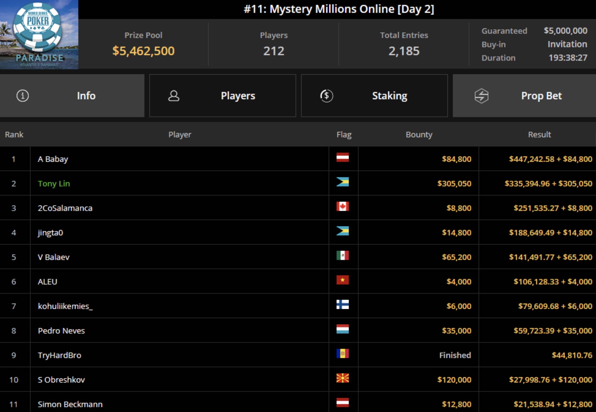 Tuto jeho částku však překonal čínský profesionální hráč Ren Lin, který sice skončil na druhém místě, ale spolu s bounty odměnami si odnesl až 640.445$. I když Bayout hrál pod rakouskou vlajkou, nejlepším německy mluvícím hráčem zde byl Simon Beckmann, který skončil na 11. místě s odměnou 34.339$.