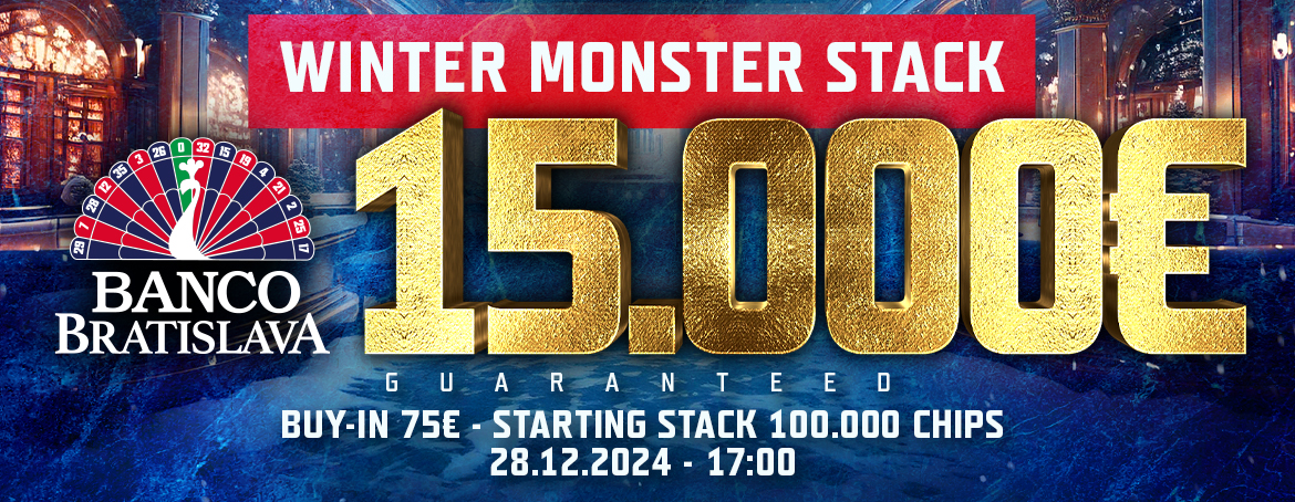 Konec roku 2024 se neúprosně blíží a zbývá už jen pár turnajů, ve kterých poznáme šampiony. Nejdříve se uskuteční 27.12. Štefánsky Špeciál s garancí 10.000€, do kterého je buy-in 50€. Po něm přijde závěrečný turnaj Winter Monster Stack, ve kterém se bude bojovat o 15.000€ za buy-in 75€. Tyto poslední dva turnaje ukončí úspěšný rok 2024 v Banco Casino Bratislava.