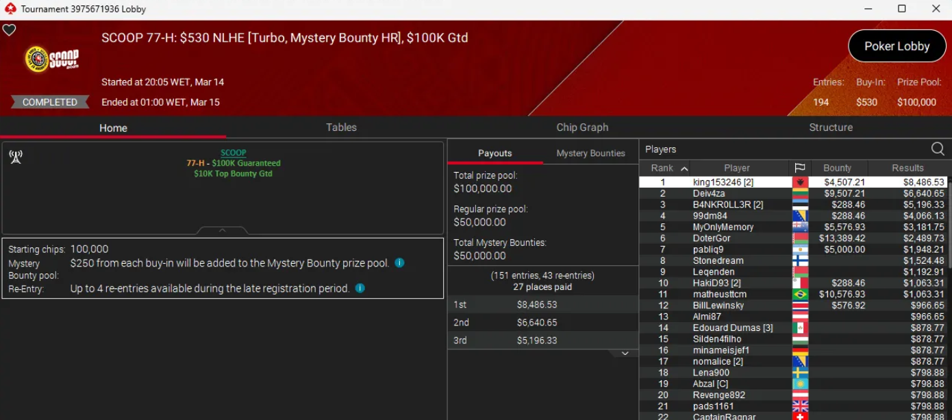 Přehled vítězných turnajů hráče „king153246“ na SCOOP 2026: