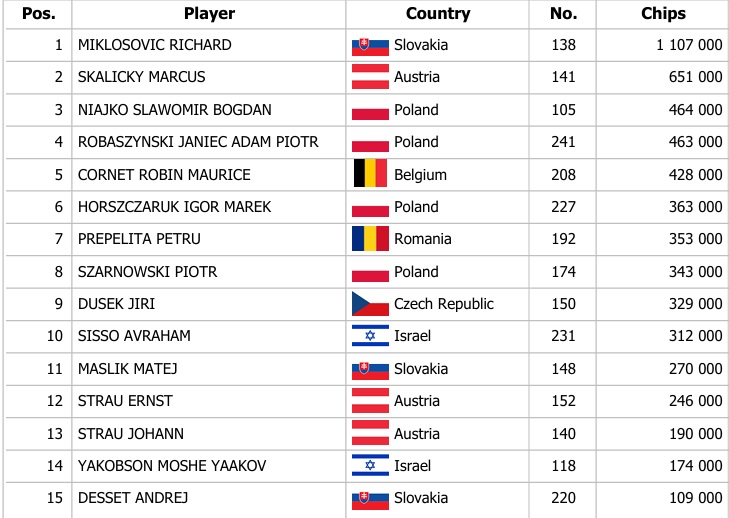 V úterý byl na programu druhý hrací den Main Eventu Summer Polish Poker Cupu, do kterého se během registrační fáze zapsalo 145 vstupů. Díky tomu si tak místo v Day 2 zajistilo 15 hráčů. Více než milionový stack si zabalil Slovák Richard Miklošovič.