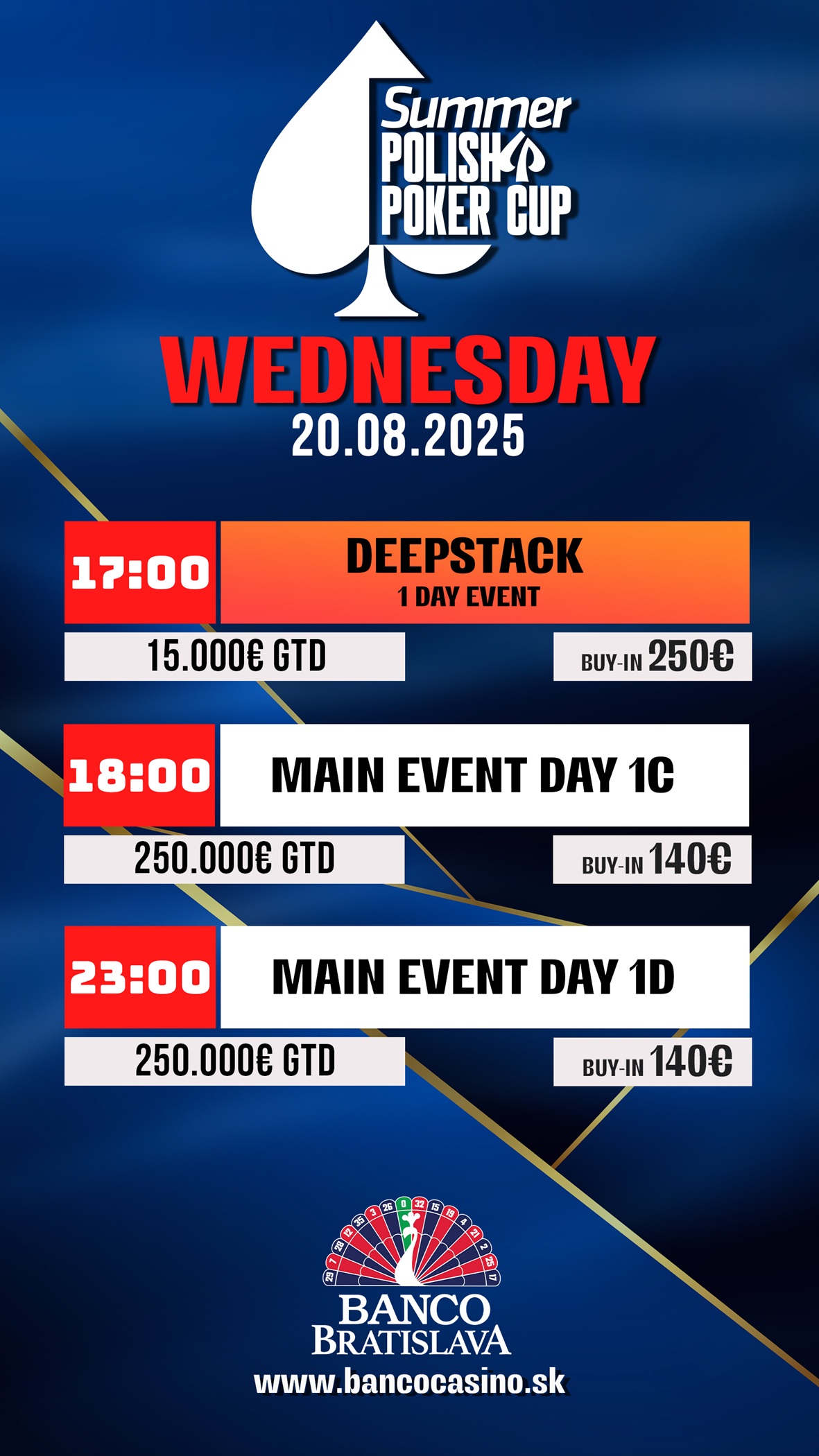 Main Event Summer Polish Poker Cupu s garantovaným prizepoolem 250.000 € má za sebou dva hrací dny, ze kterých do Day 2 postoupilo už 25 hráčů. Výborný začátek často předznamenává ještě silnější dny, které přinesou desítky až stovky tisíc eur do prizepoolu. O skvělé ceny se nebude hrát jen v Main Eventu, ale i v side eventech, které na vás teprve čekají. Jeden takový čeká už dnes. Deepstack turnaj s garancí 15.000 € startuje již v 17:00 hodin se vstupným 250 €.