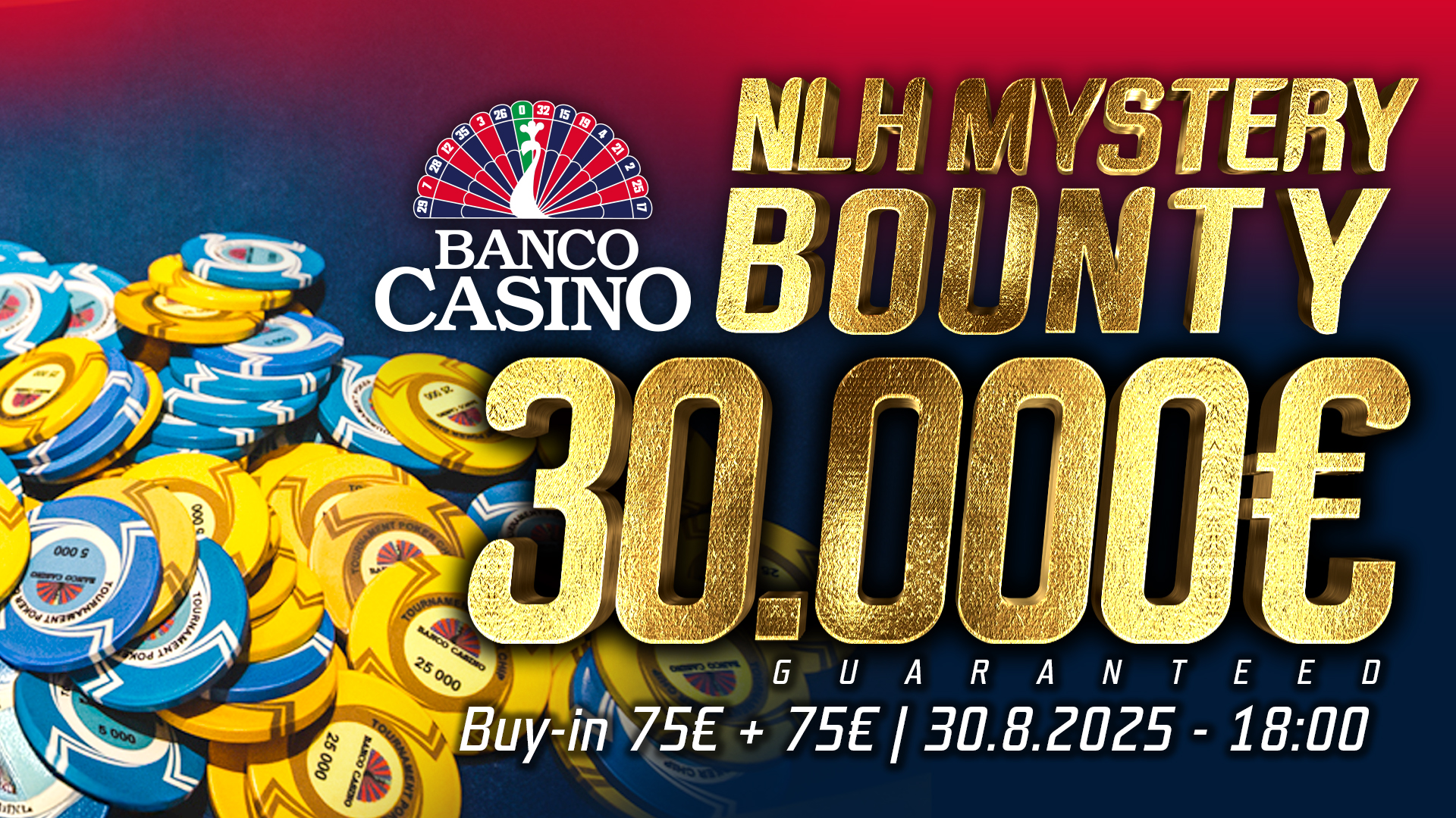 Do vybraných eventů (Highroller NLH/PLO, Heads Up Championship, Tag Team Championship) se můžete přihlásit na info@bancocasino.sk nebo přímo v kasinu u floormanažerů.