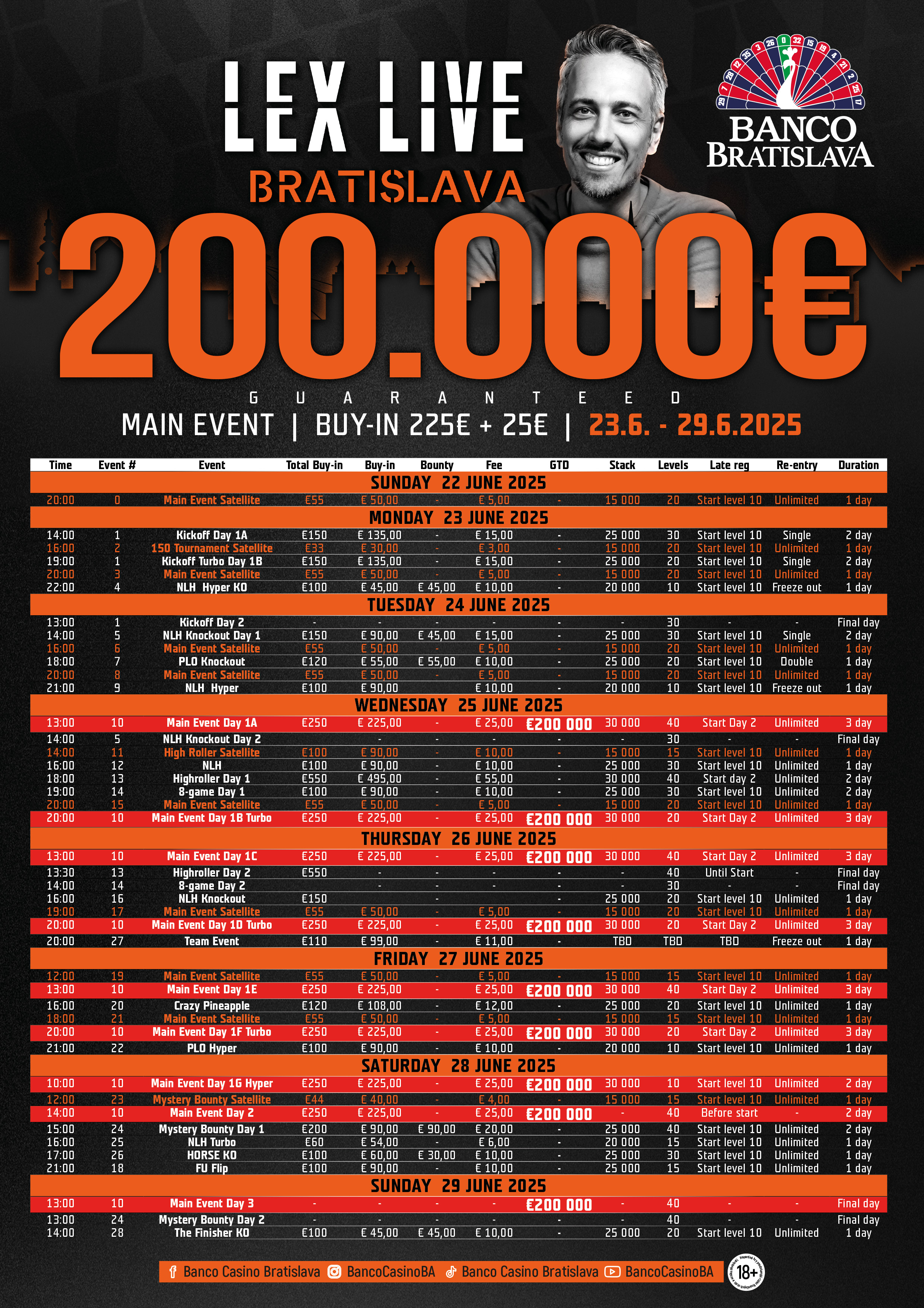 Úvodní hrací dny Main Eventu budou probíhat od středy 25. června, přičemž účastníci odehrají 14 levelů. Každý, komu se podaří „přežít“ až do konce čtrnáctého levelu, postupuje automaticky do Day 2. Registrace bude otevřena až do startu Day 2, který je na programu v sobotu 28. června. Přijďte nasát jedinečnou pokerovou atmosféru, jaká v Banco Bratislava ještě nebyla. Lex Live IV startuje už v pondělí 23. června. Kompletní harmonogram turnajů najdete níže.