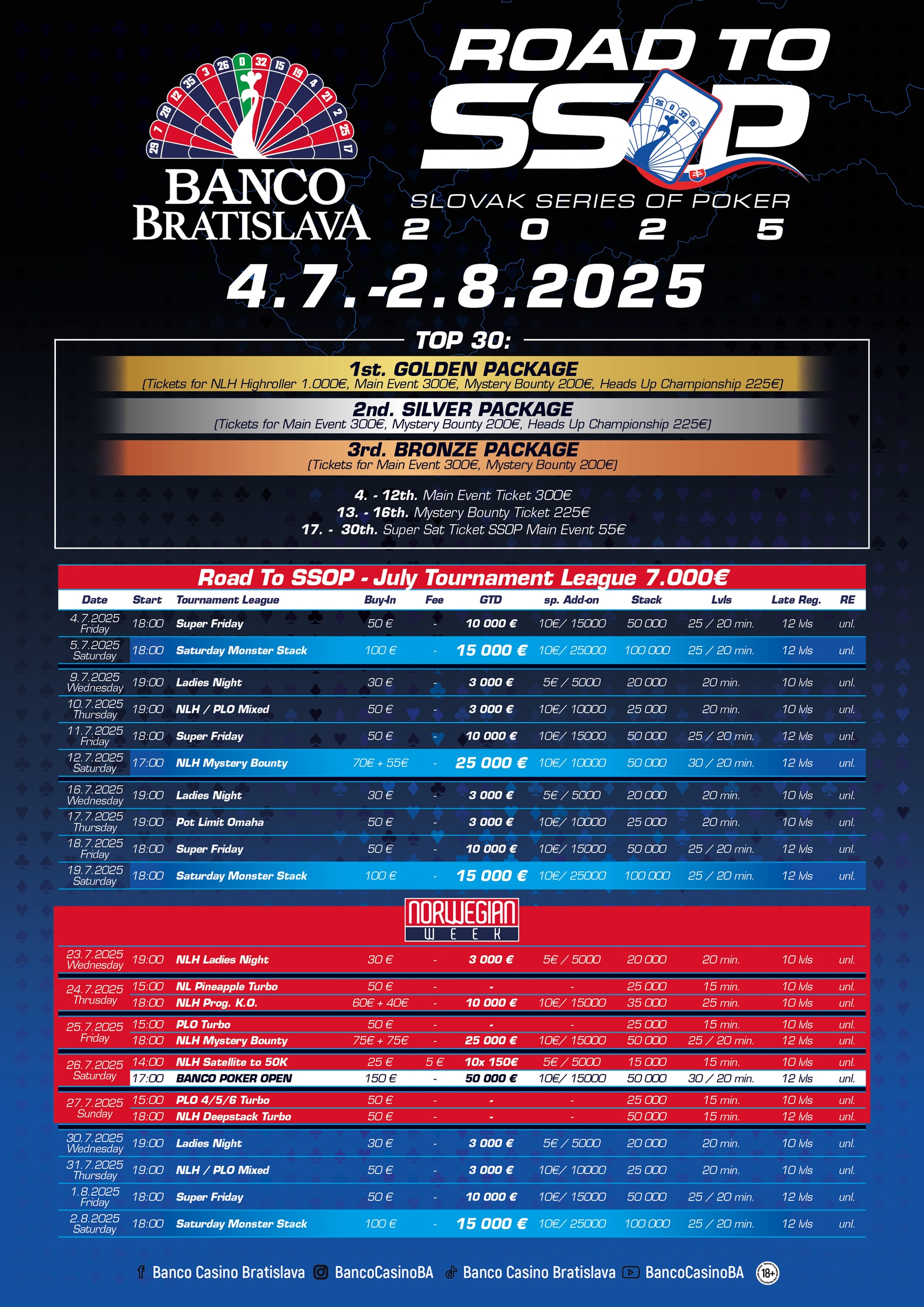 Během července přináší Banco Bratislava pro své hráče turnajovou ligu „Road to SSOP“. TOP 30 nejúspěšnějších si odnese atraktivní ceny spojené se Slovak Series of Poker 2025. Součástí ligy bude i Norwegian Week se 100.000€ prizepoolem, v jehož rámci se uskuteční také jednodenní Banco Poker Open s garancí 50.000€. Do ligové tabulky se započítávají i turnaje nadcházejícího víkendu, během něhož Banco rozdá minimálně 35.000€ v garantovaných výhrách.
