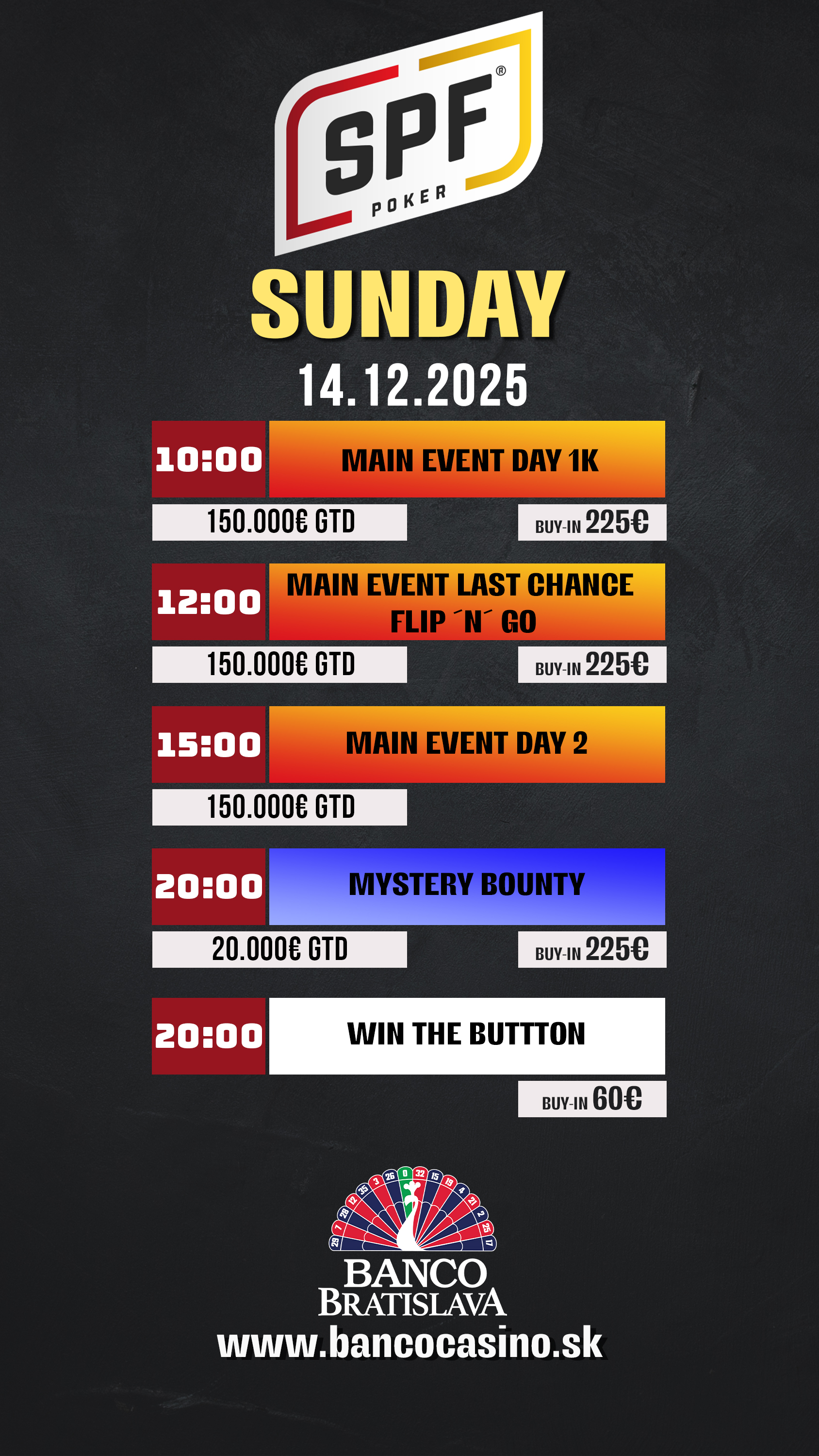 Dnešek kromě poslední šance na postup v Main Eventu a následného Day 2 přinese také dva side eventy. Oba začnou v 20:00, přičemž jeden nese název Win The Button s buy-inem 60€ a druhý Mystery Bounty turnaj s cenovkou 225€ přináší garanci 20.000€.