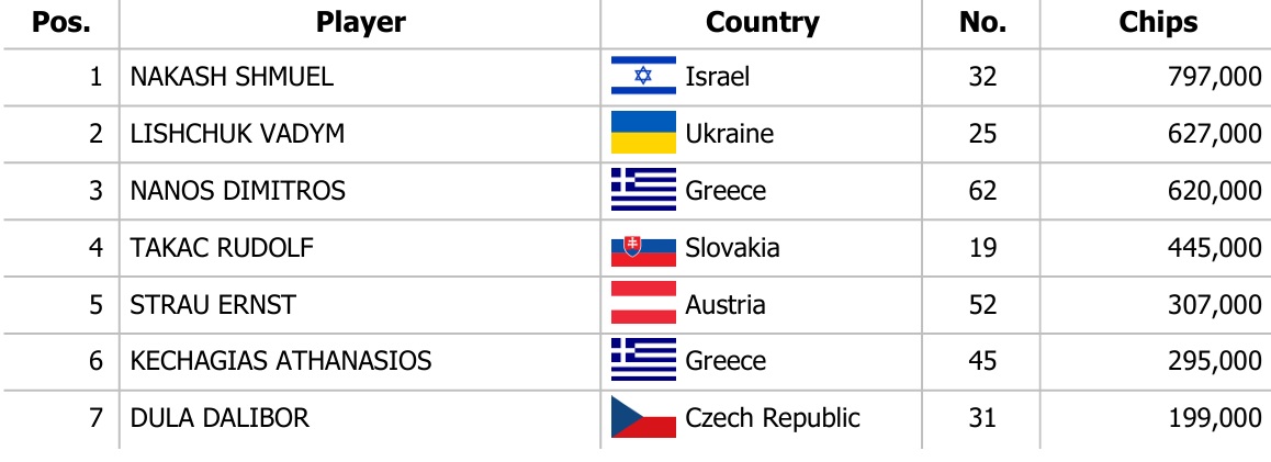 Včera se otevřely registrační brány hlavního mistrovského turnaje, na konci kterého poznáme „Mistra Slovenska v pokeru“. Otevírací den 1A zaznamenal 66 entries, z nichž se top 7 hráčů mohlo těšit na postup do nedělního Day 2. Speciální důvod k radosti měli nejlepší tři hráči, protože všechny flighty tohoto turnaje mají připravený speciální chipleader bonus, který odmění tři nejlepší hráče. Největší odměnu si připsal na úvod Shmuel Nakash z Izraele, bonusové odměny si ale odnesli i Ukrajinec Vadym Lishchuk a Řek Nanos Dimitros.