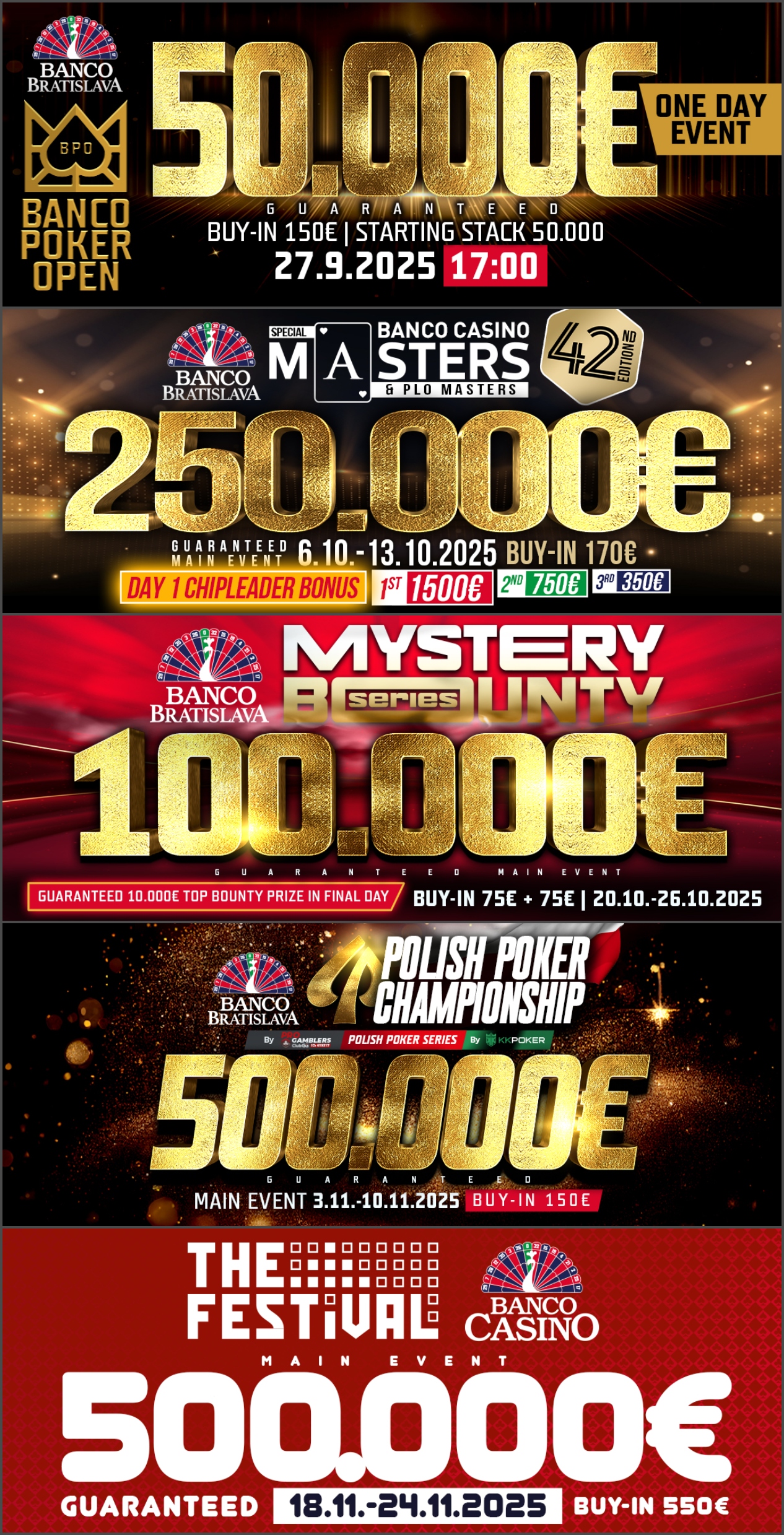 A je to tady! Série Slovak Series Of Poker je zpět a centrum Bratislavy se během následujících dnů opět promění v epicentrum skvělého pokeru. Main Event s garancí 300,000€, šťavnaté cashovky a turnaje všech možných formátů – to vše a mnohem více na vás čeká v Banco Bratislava až do pondělí!