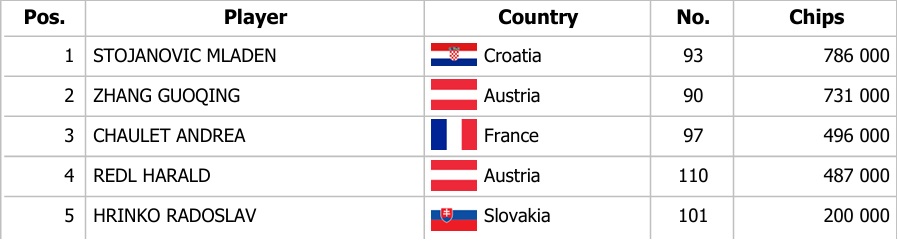 Včerejší největší bonus 2.100€ si odnesl Mladen Stojanovic z Chorvatska, který si zabalil stack v hodnotě 786 000. Celkově se během dne 1B zaregistrovalo 54 entries, ze kterých se do konce dne utvořilo 5 postupujících.