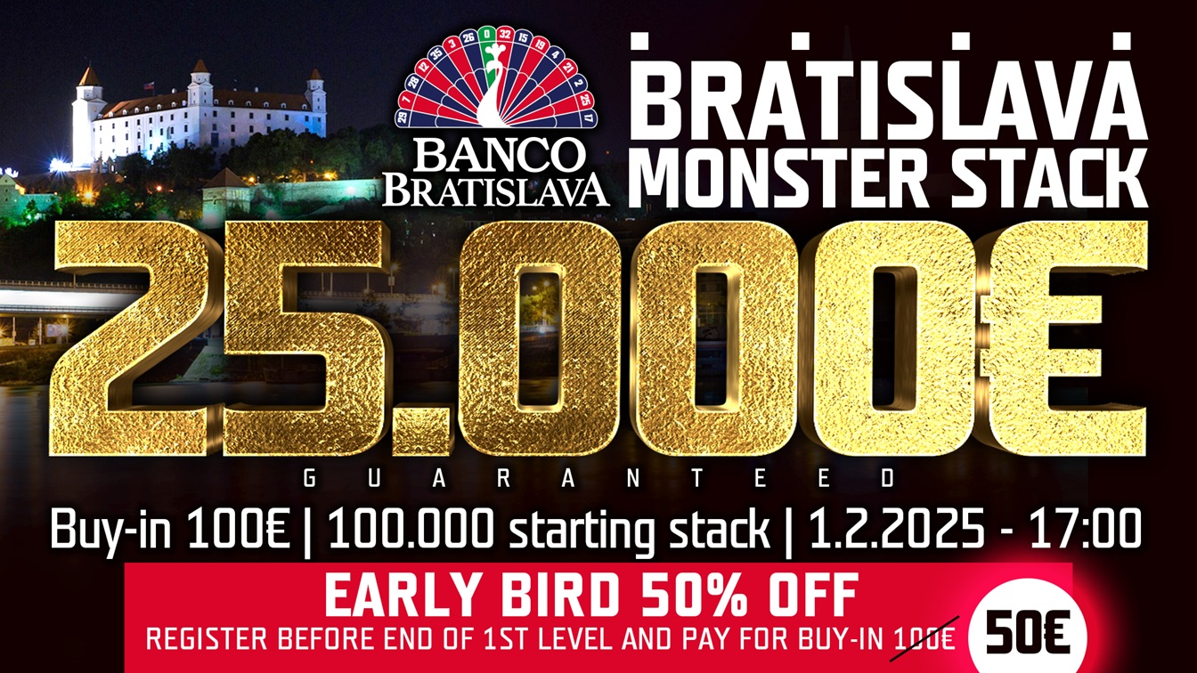 Sobota se v Banco Bratislava bude nést v duchu Monster Stack, ve kterém se bude hrát až o 25.000€. Klasické vstupné je 100€, ale díky 50% slevě do konce 1. levelu, si zahrajete tento turnaj jen za 50€. Start je nastaven na 17:00, takže akce bude probíhat do 17:30. Skvělá struktura, startovní stack 100.000 chipů a vítězná trofej pro šampiona - to vše vás čeká v Banco Bratislava.