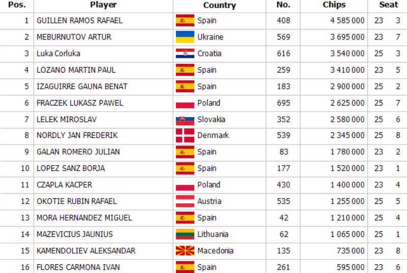Do závěrečné fáze se probojovala již zmíněná šestnáctka finalistů, na které čeká už jen poslední krok na cestě k titulu. Chipleaderem je Ramos Rafael Guillen, který si do dnešního finále zabalil 4.585.000. Ve hře je stále i domácí hráč Miroslav Lelek, jehož stack 2.580.000 řadí na průběžnou sedmou pozici.
