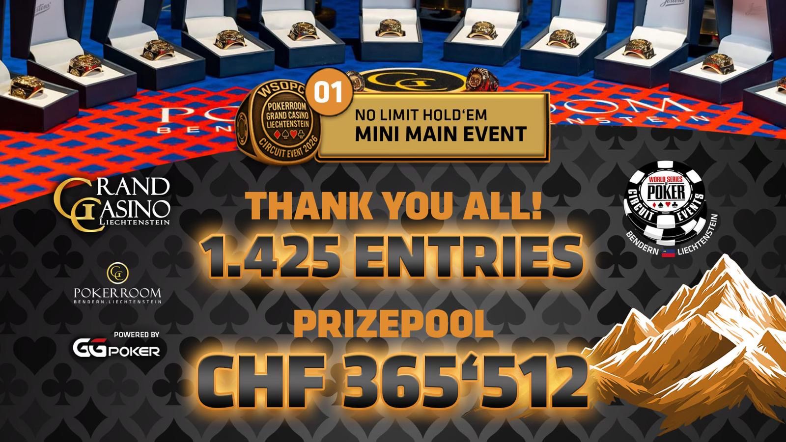 Úvodní prsten se rozdával v Mini Main Eventu (270CHF+30CHF) s garancí 200.000CHF – a už během flightů bylo jasné, že se půjde daleko za čáru. Nakonec se turnaj zastavil až na 1.425 entries a vyprodukoval prize pool 365.512CHF.