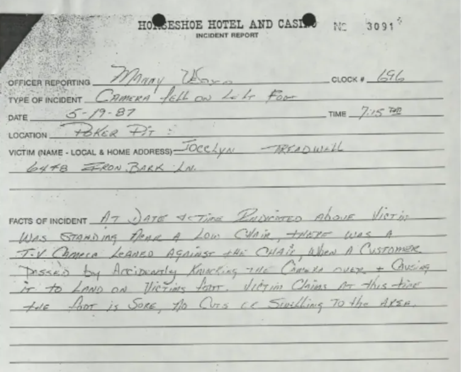 Bis auf eine Sache: Am 19. Mai fiel eine der Fernsehkameras direkt auf den Fuß eines Zuschauers. Der Vorfall fand Eingang in den Bericht des Casinos, in dem es hieß, die Kamera habe an einem Stuhl gelehnt und sei von einem vorbeigehenden Kunden versehentlich umgestoßen worden. Das Ergebnis? Eine Verletzung und ein anschließender Rechtsstreit. Der Fernsehsender ESPN, der kein direkter Produzent war, wurde wiederholt mit dem Vorfall in Verbindung gebracht, was ihn sehr verärgerte. Schließlich einigten sich Binion's Horseshoe und Translor Films auf eine außergerichtliche Einigung mit dem Opfer.