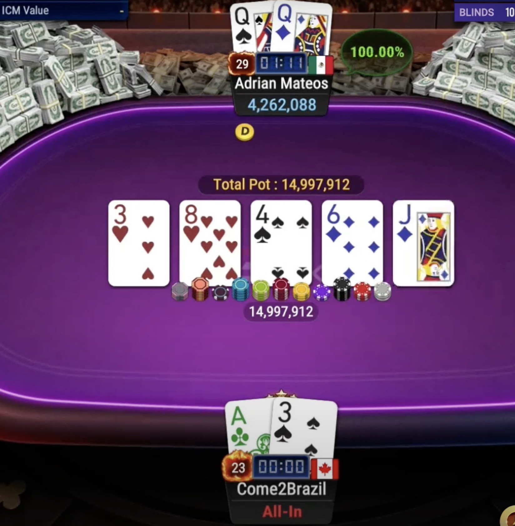 Adrian Mateos trat mit einem Stack von 12,1 Millionen und Santiago "Come2Brazil" Plante mit 7,1 Millionen in das finale Heads-up. Das Heads-up-Spiel dauerte nur drei Hände, bevor Adrian Mateos als Champion gekrönt wurde. Es war sein 18. GGMillion$-Finaltisch, und er sicherte sich seinen vierten Titel. Insgesamt hat er nun mehr als $4 Millionen aus GGMillion$-Turnieren gewonnen. Santiago "Come2Brazil" Plante, der sich über das Satellite qualifizierte, belegte den 2. Platz und nahm $294.841 mit nach Hause.