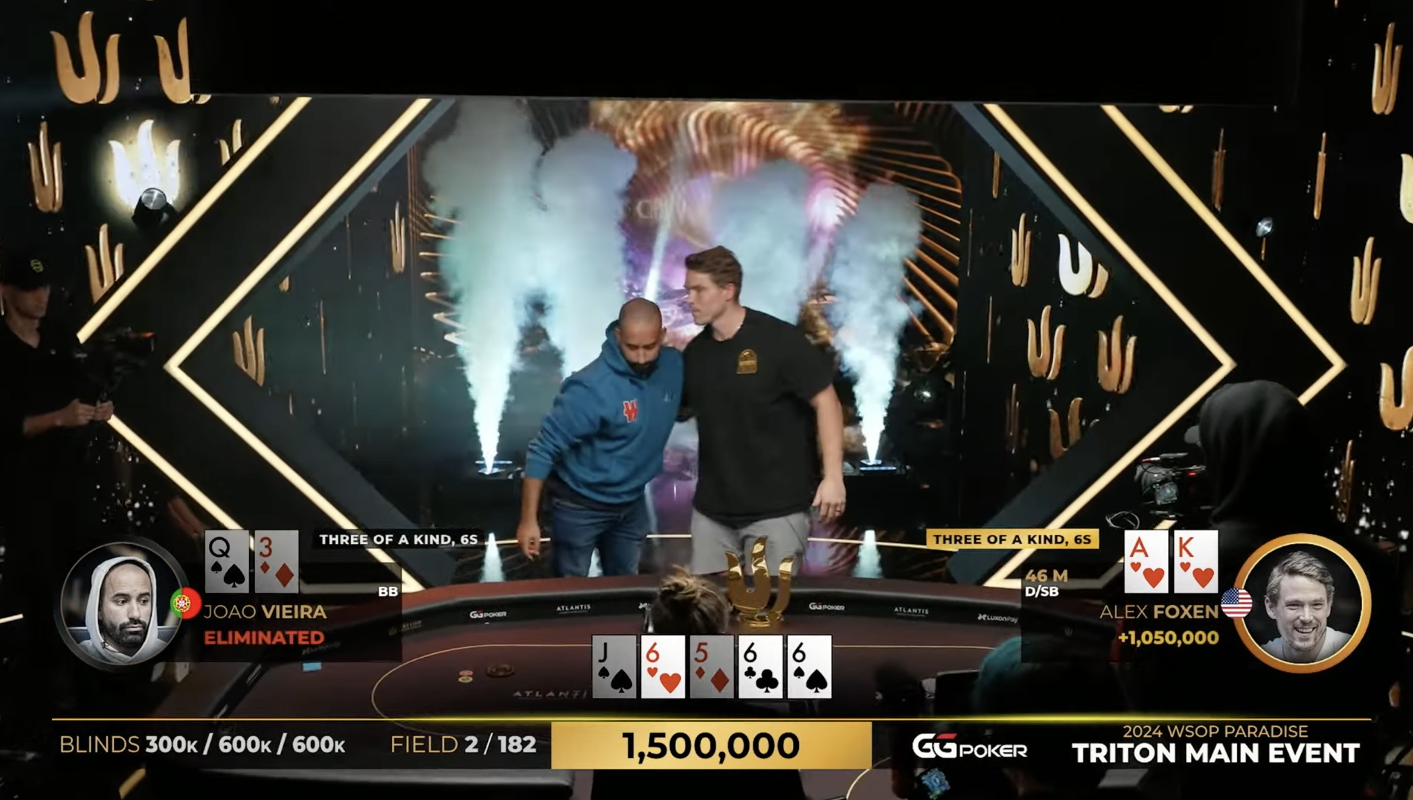 Alex Foxen und Joao Vieira traten im Heads-up gegeneinander an, wobei Alex einen Stack von 33.050.000 und Joao einen Stack von 12.450.000 hatte. Das gesamte Heads-up dauerte nur 6 Hände und in der letzten Hand hatte Joao nur noch einen Stack von 450.000. Nachdem das Board ausgeteilt wurde, wurde Alex Foxen der neue Triton Main Event-Champion und WSOP-Braceletgewinner. Er gewann damit sein drittes Armband in kurzer Zeit und verkleinert den Abstand zu seiner Frau Kristen, die 5 Bracelets besitzt. Er steigerte seine Gesamtgewinne bei Live-Turnieren auf über $42,5 Millionen.
