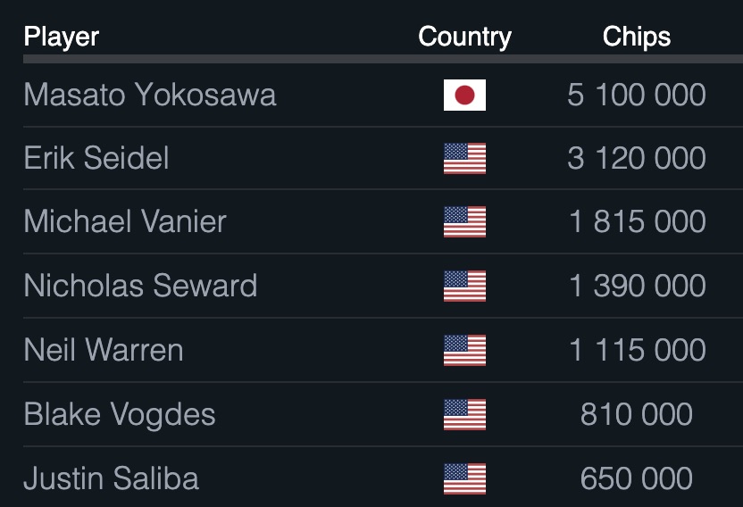 Der Chipleader ist der Japaner Masato Yokosawa mit einem Stack von bis zu 5.100.000. Am anderen Ende liegt Justin Saliba mit einem Stack von nur 650.000. Allen Spielern ist bereits ein Preisgeld von mindestens $22.400 sicher.