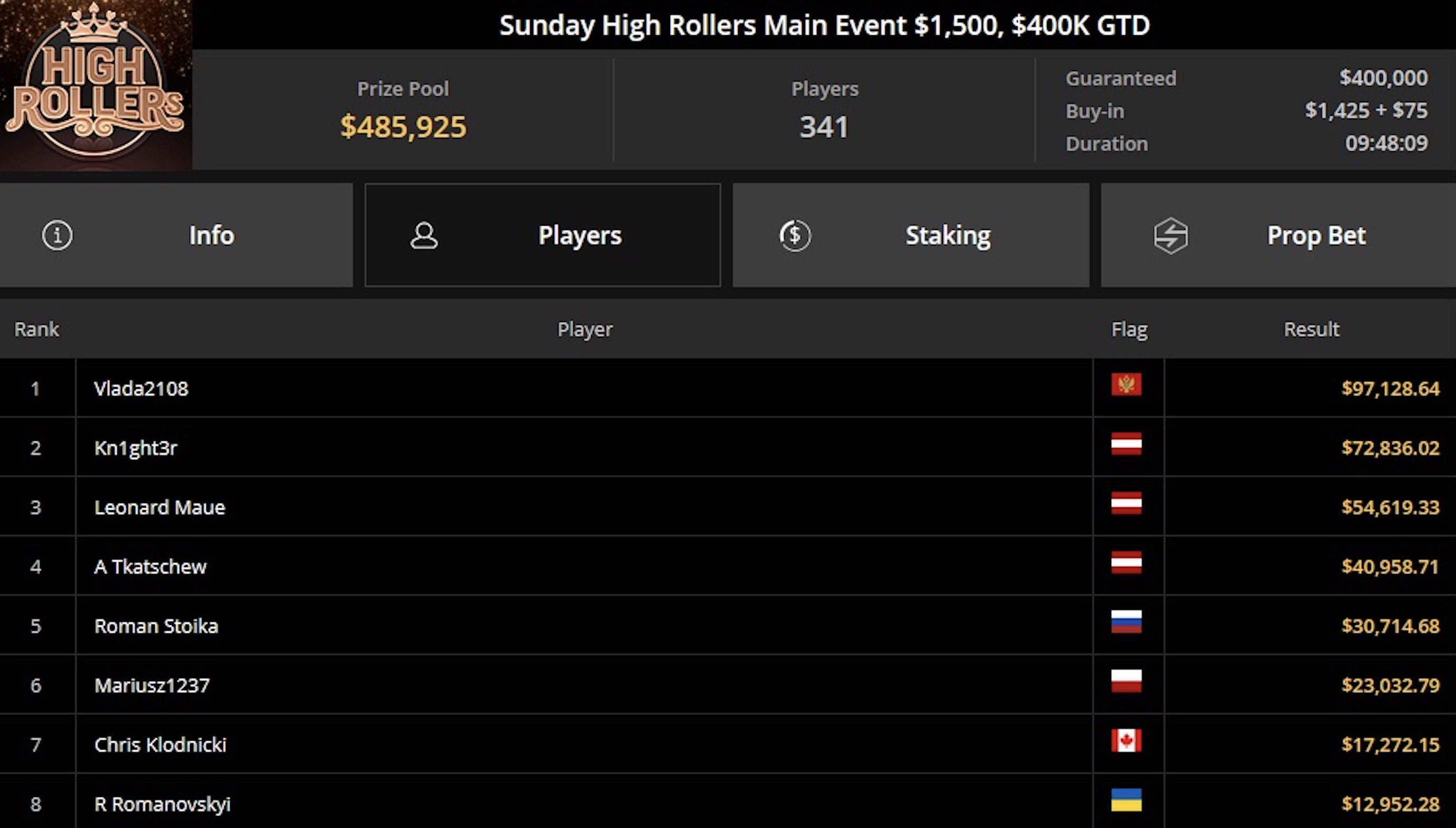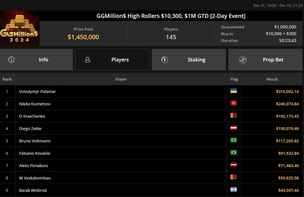 Auf den Sieger wartete ein Preisgeld von $315.092, und auch Diego Zeiter kämpfte um diese Summe. Er belegte hier den 4. Platz, der mit $150.079 dotiert war. Der Gewinner war der ukrainische Spieler Volodymyr Palamar.