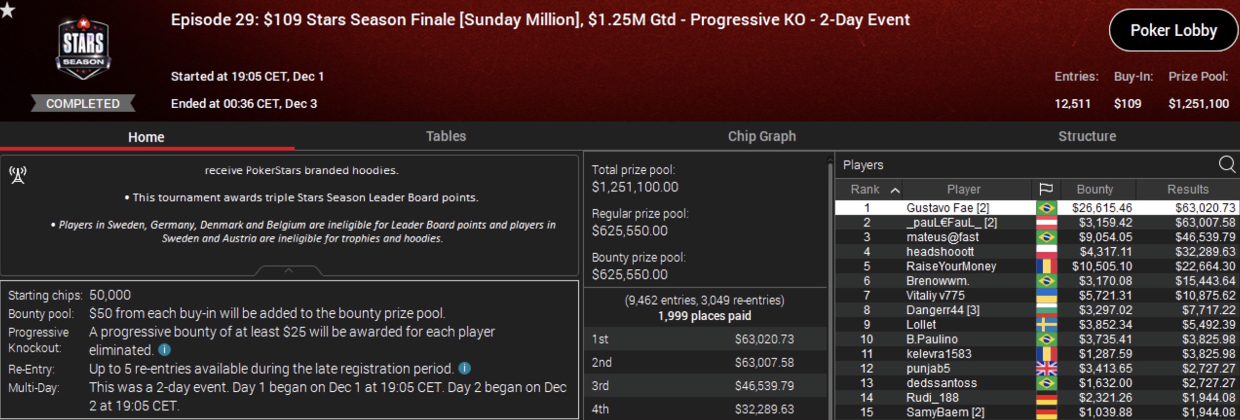 Kommen wir nun zu PokerStars, wo Paul "_pauL€FauL_" Höfer bei der Sunday Million PKO mit einem Buy-in von $109, 12.511 Entries und einem Preispool von $1.251.100 ins Heads-Up kam. Paul belegte hier den zweiten Platz und verdiente so $66.167 zusammen mit Bounty-Preisen.
