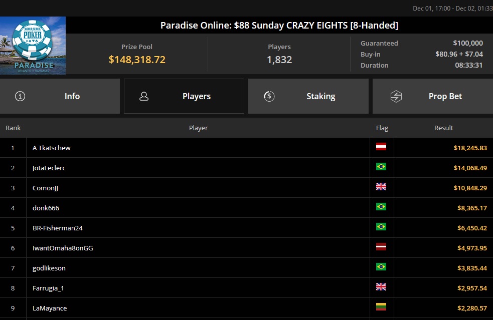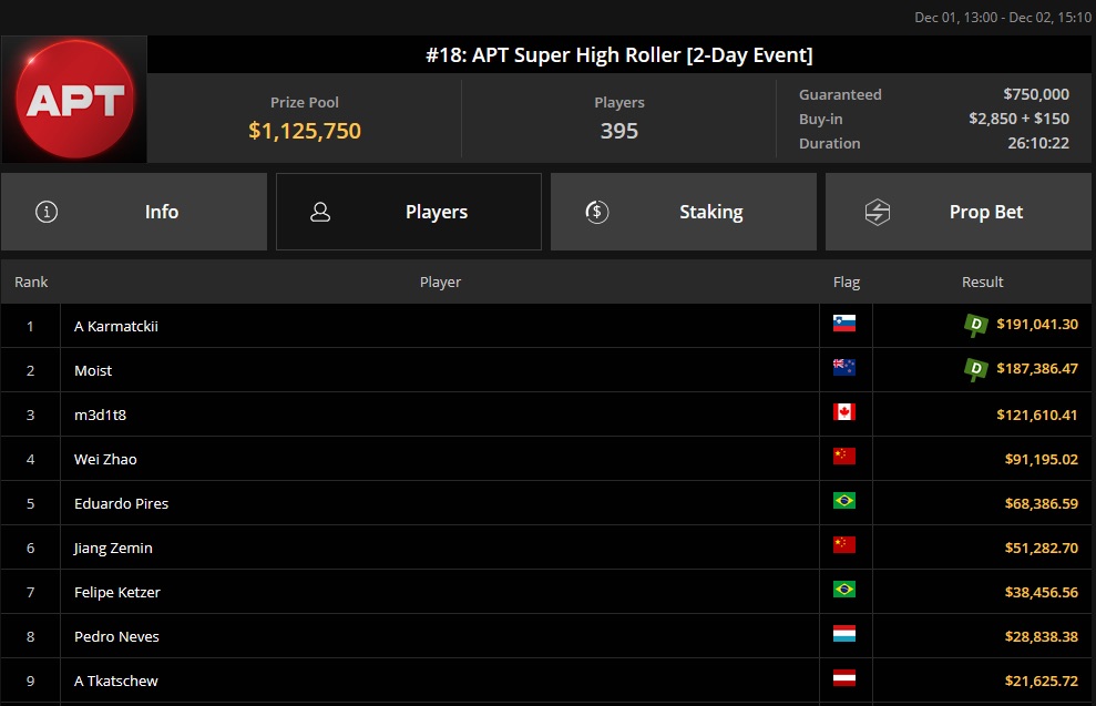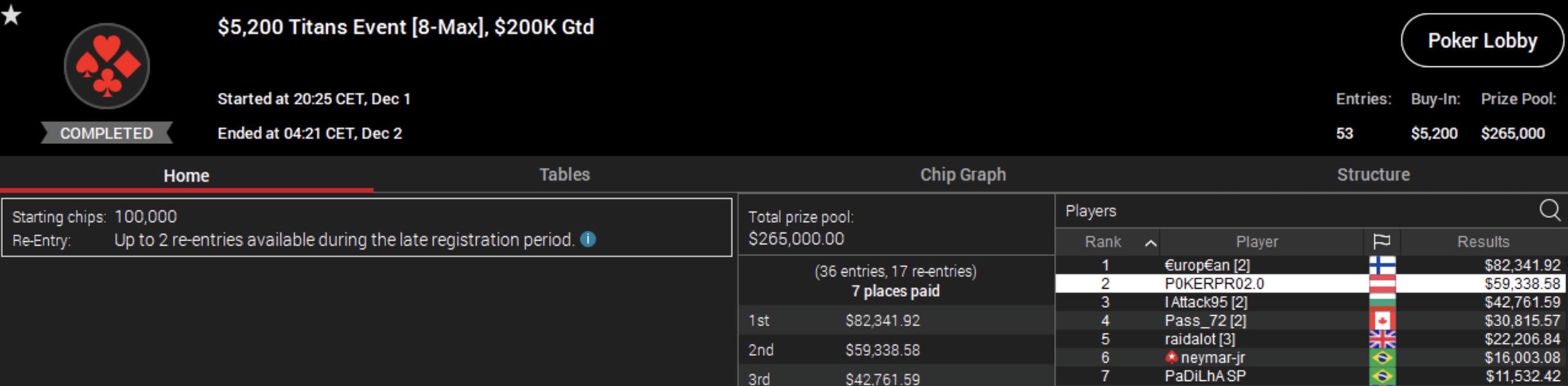 Abschließend möchten wir noch einen weiteren Sieg erwähnen, und zwar den von "P0KERPR02.0", der beim $5.200 Titans Event mit 53 Teilnehmern und einem Preispool von $265.000 mitspielte. Dieser belegte ebenfalls den zweiten Platz und fügte seinem Konto $59.338 hinzu. Eine interessante Besonderheit dieses Turniers war der berühmte Fußballspieler Neymar Jr., der den 6. Platz belegte und einen Preisgeld von $16.003 gewann.
