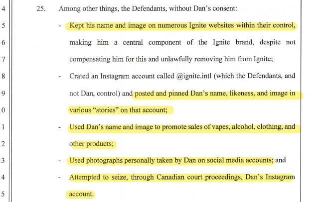 Dan Bilzerian soll Ignite mehrfach aufgefordert haben, seinen Namen und sein Bildnis nicht mehr zu verwenden. Der Klage zufolge lehnte Rupy Dhadwar diese Bitten ab und verwendete weiterhin Dans Namen und Bildnis und weigerte sich, sie aus Marketingmaterialien zu entfernen.