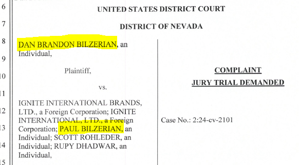 Am 12. November 2024 reichte Dan Bilzerian seine eigene Klage beim Bezirksgericht von Nevada ein und verklagte seinen Vater Paul, dessen Firma Ignite, Scott Rohleder und Ignite-CEO Rupy Dhadwar. In der Klage behauptet Dan Bilzerian, dass er nie direkt in die Geschäfte des Unternehmens involviert war und bis Dezember 2023 lediglich ein Aushängeschild für das von ihm gegründete Unternehmen war. Angeblich wurde er von seinem eigenen Unternehmen entlassen, aber das Unternehmen verwendete weiterhin seinen Namen und sein Gesicht, obwohl er damit nicht einverstanden war. Dan soll das Unternehmen im Jahr 2017 gegründet haben, und obwohl er der Mehrheitseigentümer ist, heißt es in der Klage, dass er nur der nominelle CEO war.