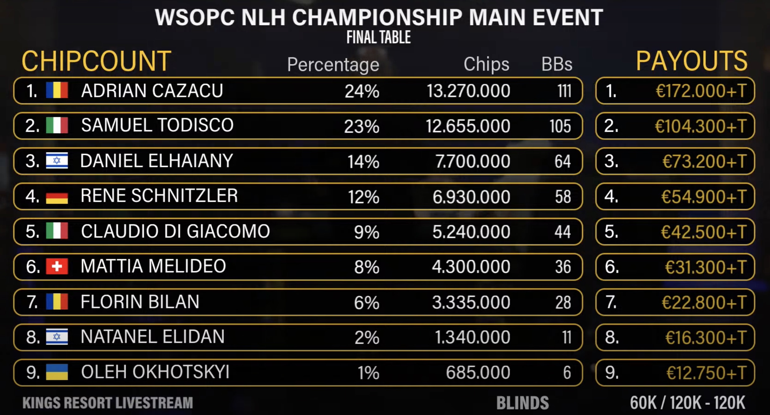 Der rumänische Spieler Adrian Cazacu führte die Runde an, doch auch zwei DACH-Spieler mischten kräftig mit: Mattia Melideo sicherte sich den 4. Platz und €54.900, während Rene Schnitzler mit seinem 3. Platz sogar €73.200 gewann.
