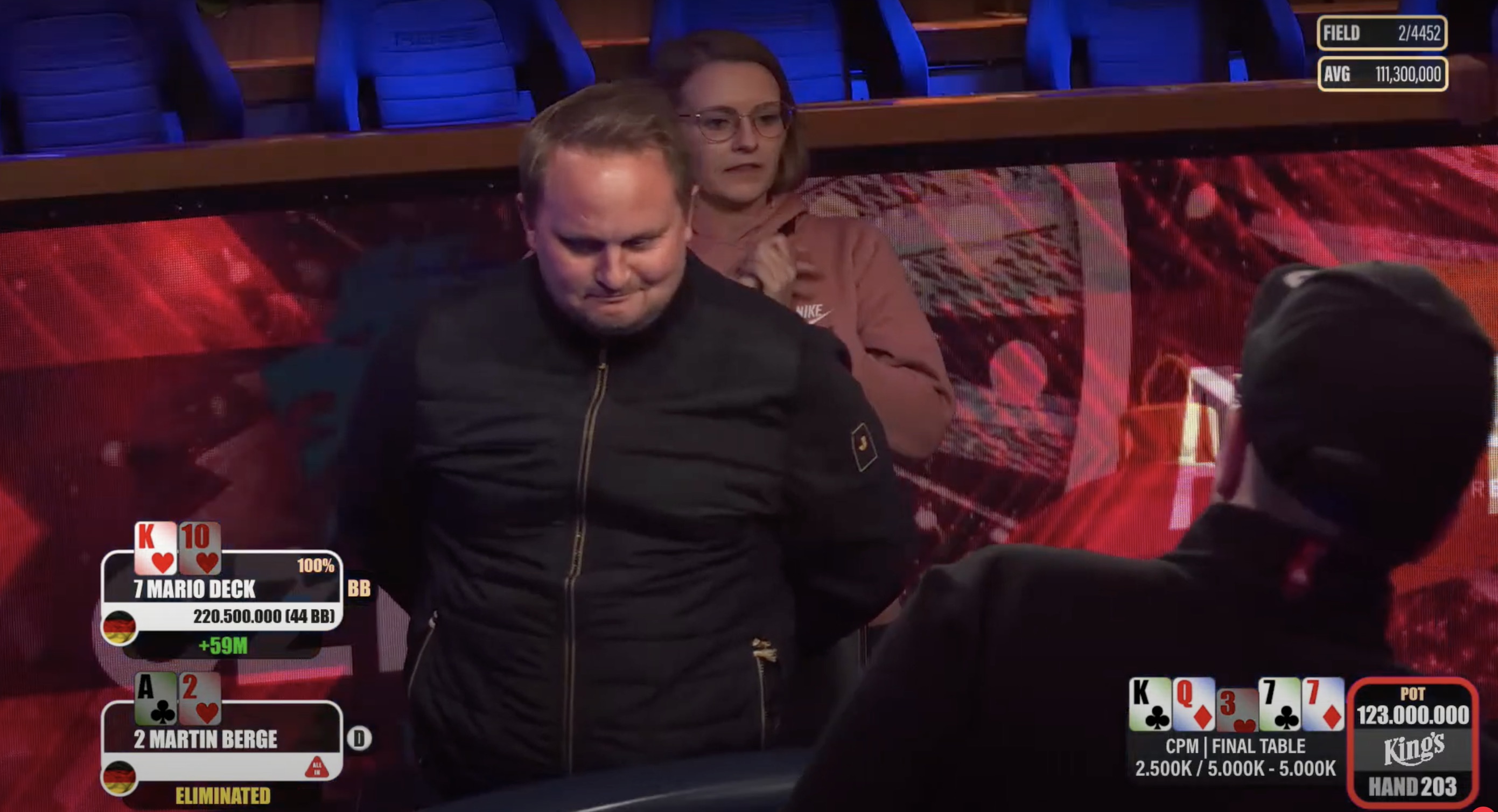 Die verbliebenen fünf Spieler vereinbarten einen Deal, wobei zusätzlich etwa €7.000 für den Zweitplatzierten und ca. €11.000 für den Sieger auf dem Spiel standen.