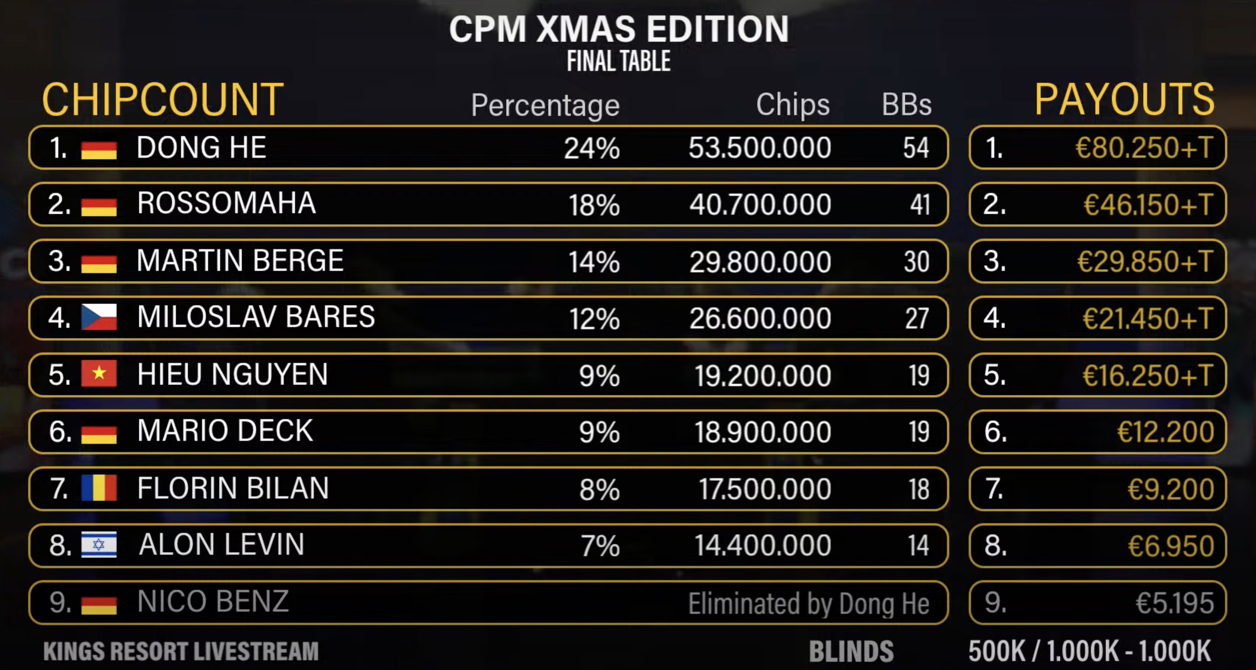 Trotz der Feiertage zog das Turnier 4.452 Anmeldungen an, wodurch der Preispool auf beeindruckende 544.034 € anstieg. Der Gewinner konnte sich auf 80.250 € freuen, und der tschechische Spieler Miloslav Bareš hatte beste Chancen auf den Sieg, da er als einer der 43 Finalisten mit einem großen Stack in den letzten Tag startete.