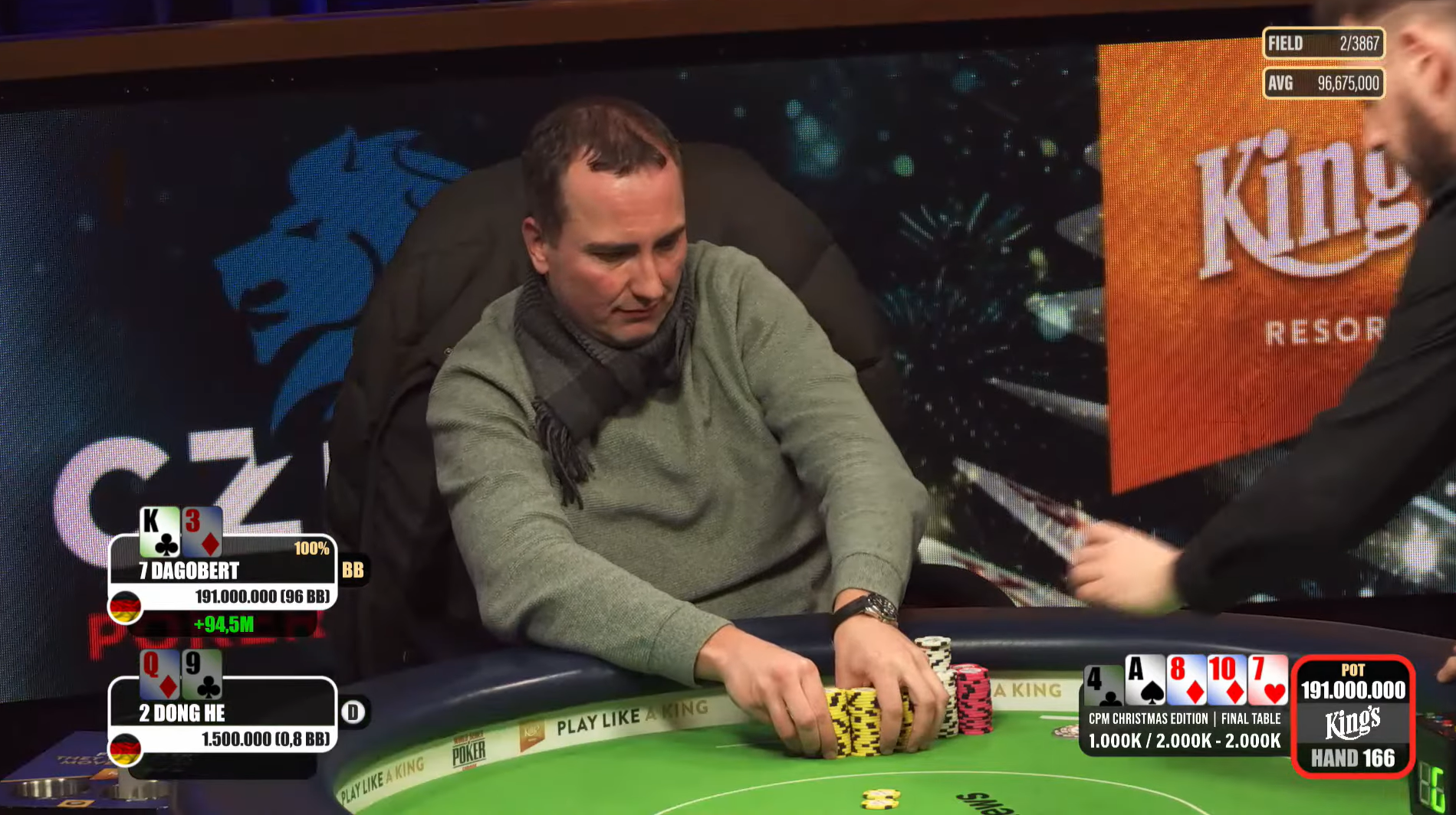 Den größten Gewinn und den offiziellen Titel sicherte sich Dagobert aus Deutschland, der 58.000€ aus Rozvadov mitnahm. Auf dem zweiten Platz landete sein Landsmann Dong He. Das entscheidende Spiel fand mit nahezu identischen Stacks statt. Dong He ging All-in mit Q d 9 c und Dagobert callte mit K c 3 d. Der Board 4 c A s8 d T d 7 h verfehlte beide. Dong He hatte nach dieser Hand weniger als einen Big Blind und schied zwei Hände später aus.
