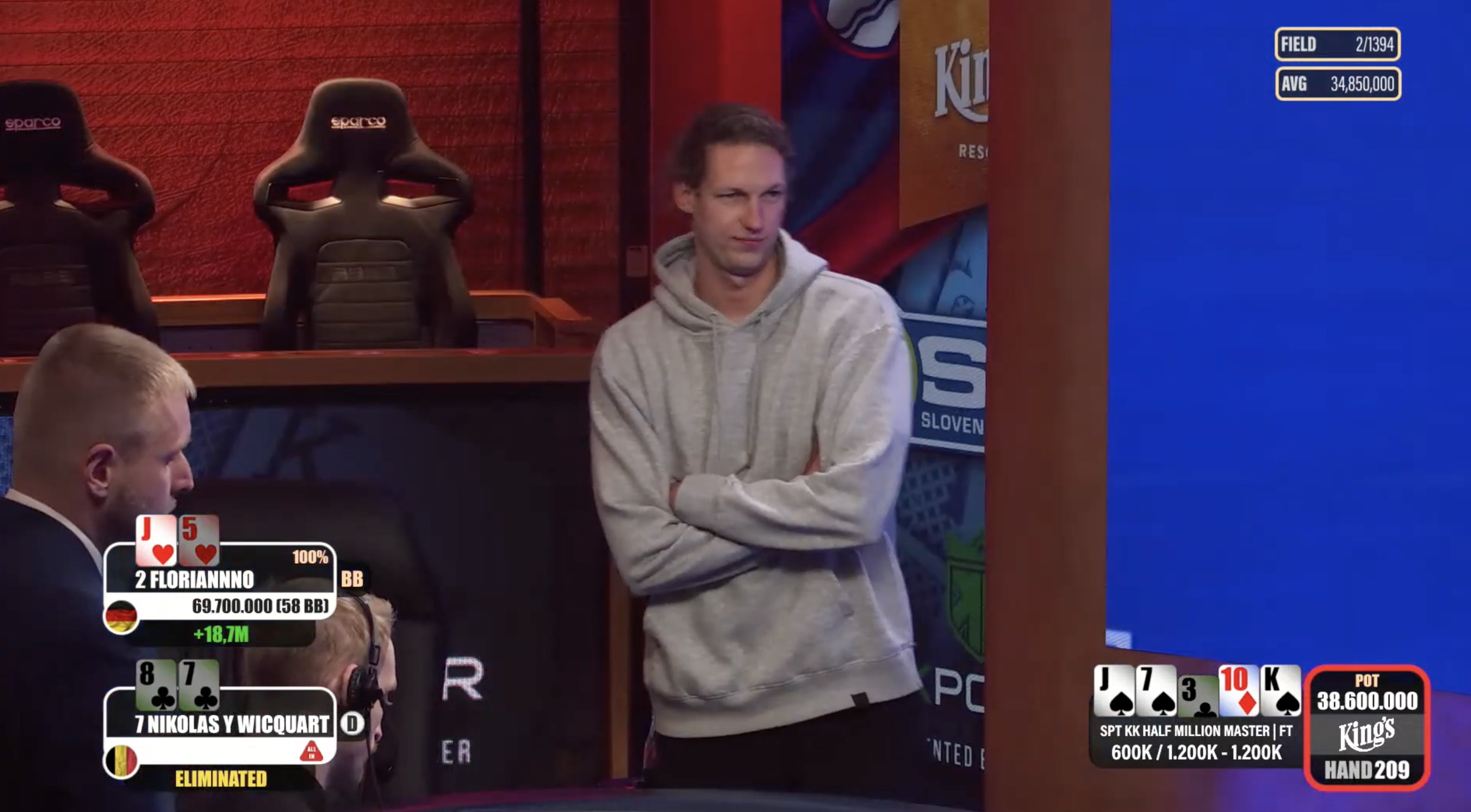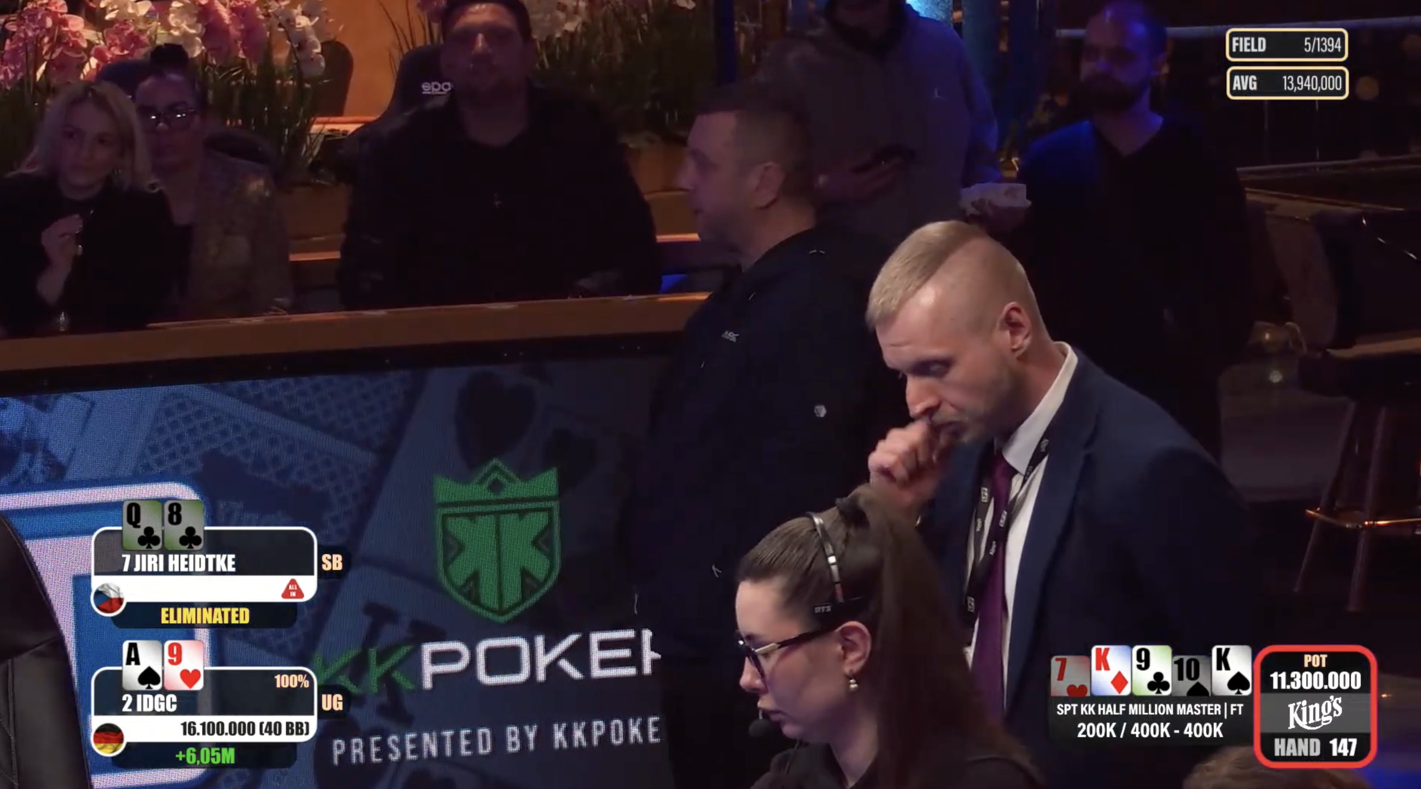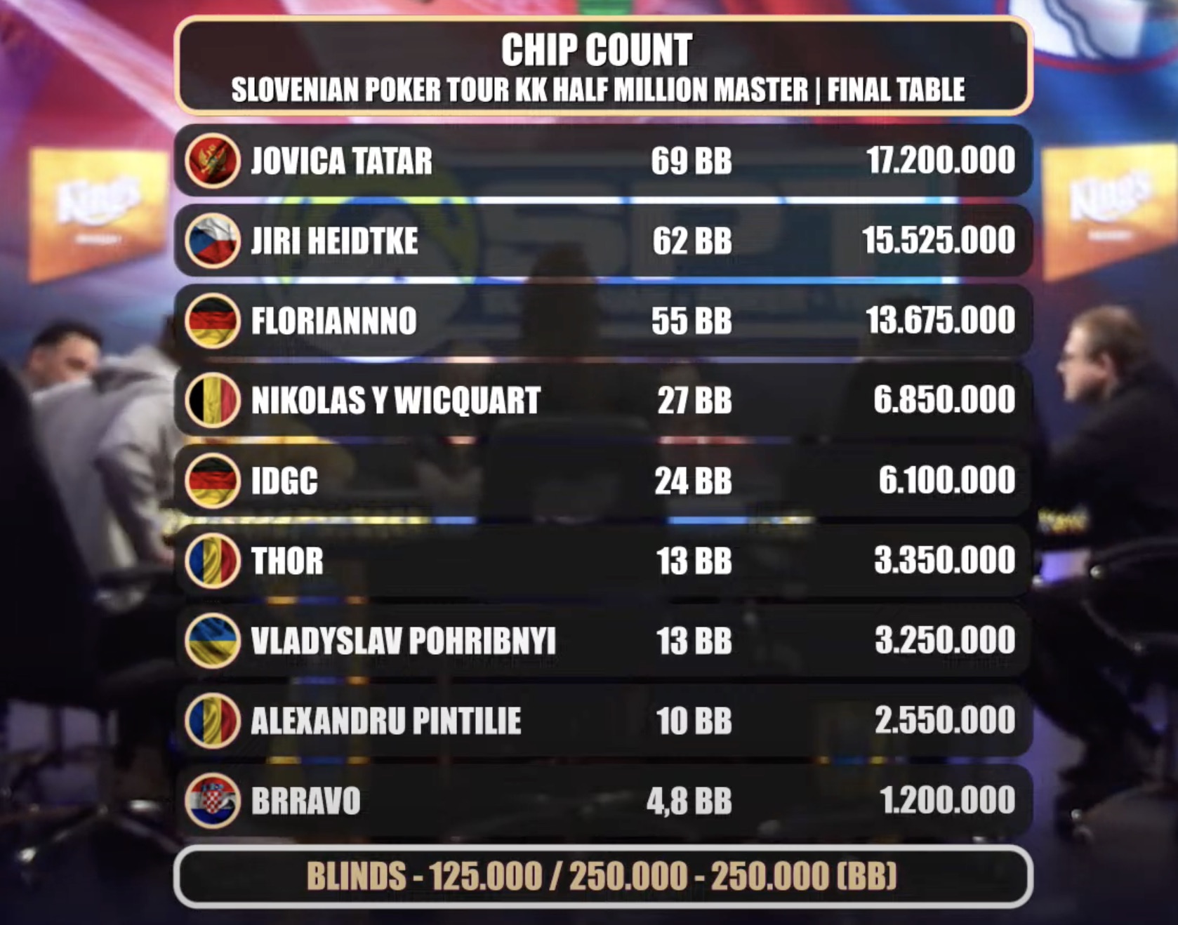 Nachdem sich die fünf besten Spieler auf einen Deal geeinigt hatten, wurde der Sieger ermittelt. Jiri Heidtke nahm die geringste Belohnung mit und landete auf dem fünften Platz mit €21.142.
