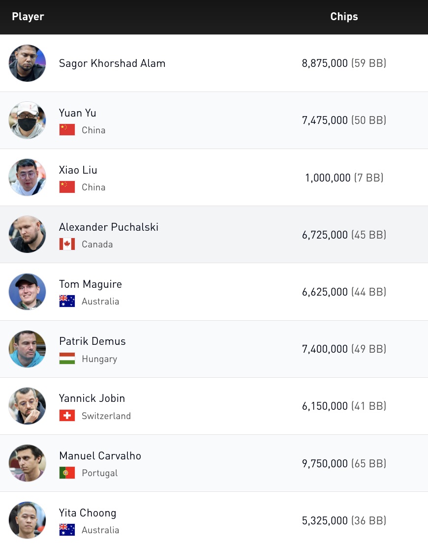 Der Finaltisch mit neun Plätzen wurde vom Portugiesen Manuel Carvalho angeführt, der mit 9.750.000 Chips als Chipleader startete. Xiao Liu aus China hatte hingegen nur 1.000.000 Chips und lag damit auf dem letzten Platz. Auch der Schweizer Yannick Jobin war noch im Rennen, mit einem Stack von 6.150.000. Jeder der verbliebenen Spieler hatte bereits mindestens $22.900 gewonnen.